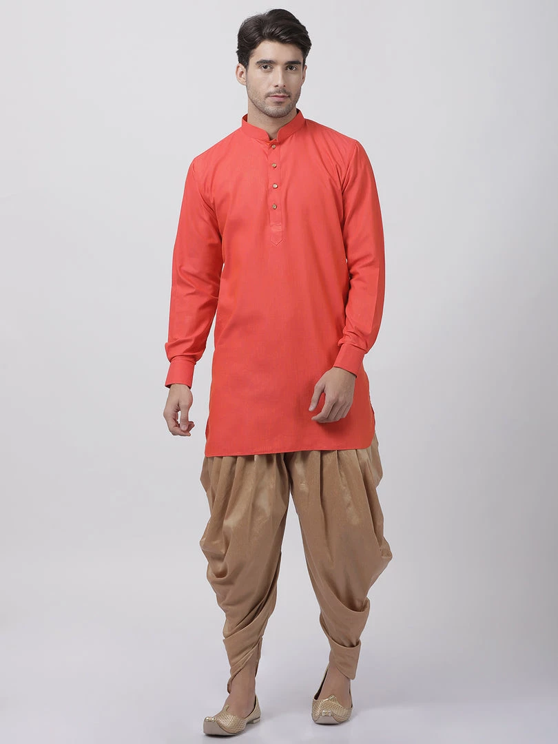 Orange solid above knee length pathani kurta, has a mandarin collar, long sleeves, button placket, curved hem, side slits