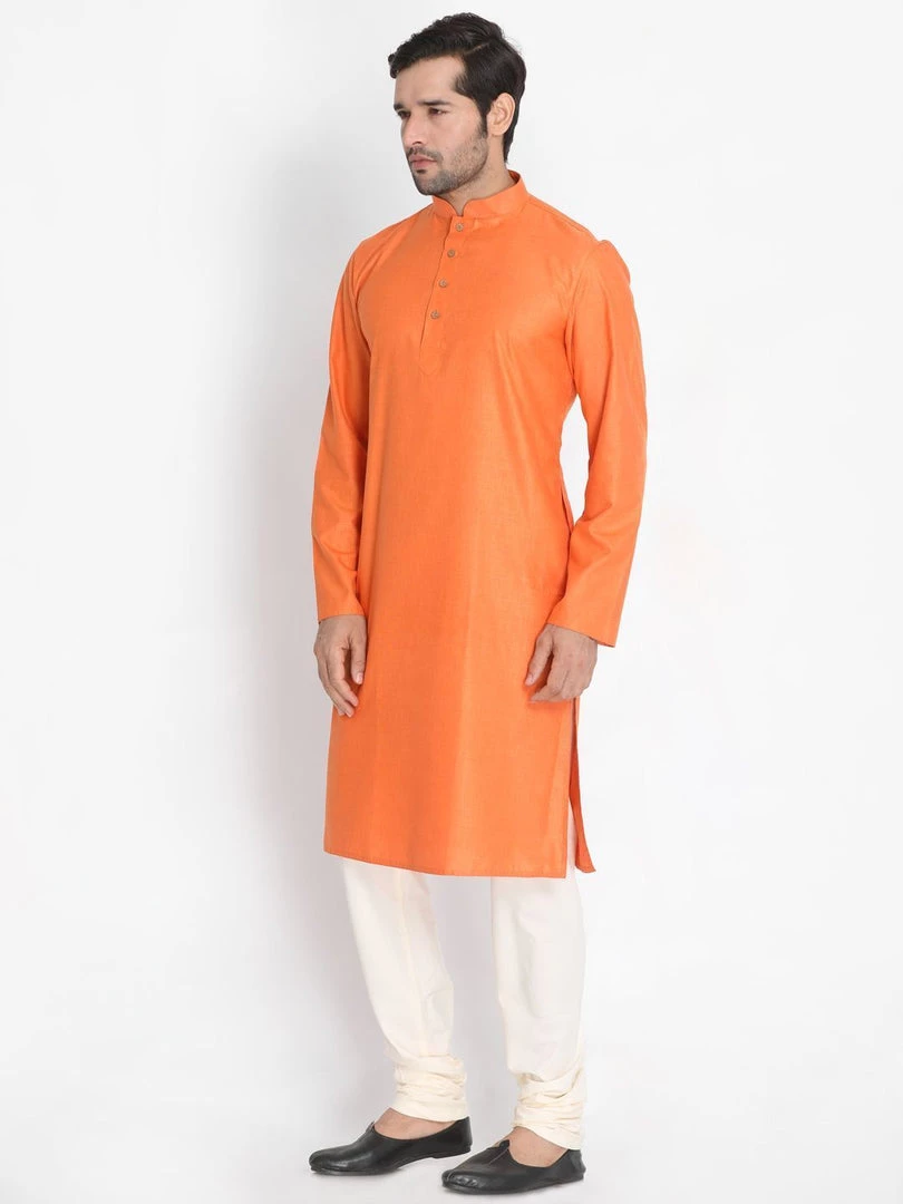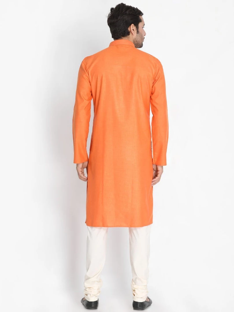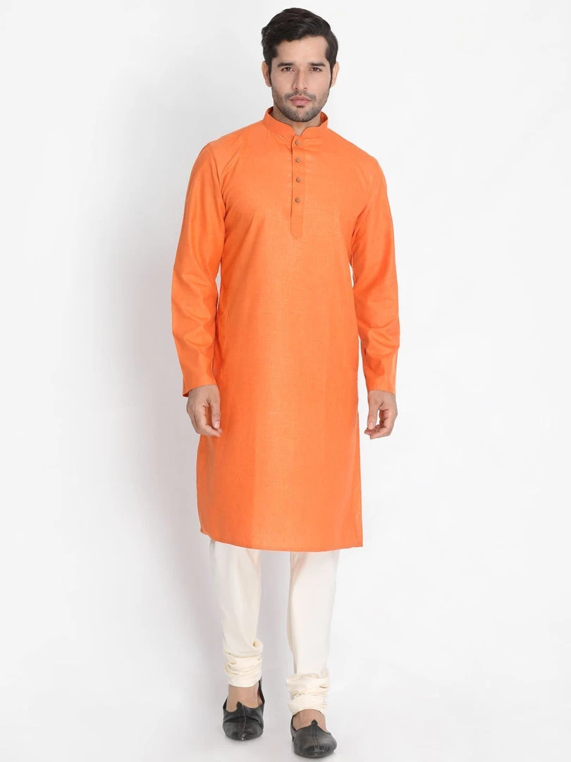Orange straight knee length kurta, has a mandarin collar, long sleeves, button placket, straight hem