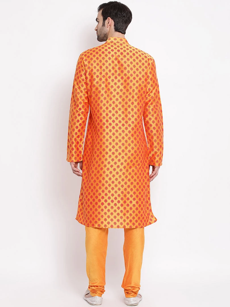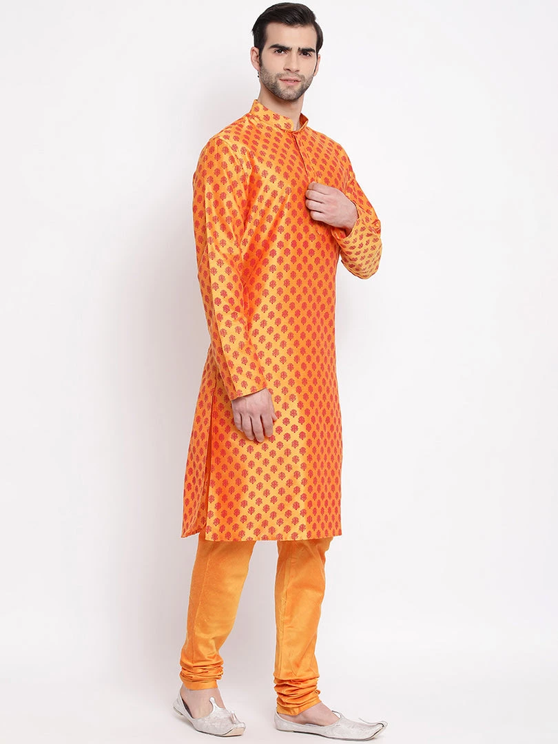 Orange and red printed straight knee-length kurta, has a mandarin collar, button placket, long sleeves, straight hem.