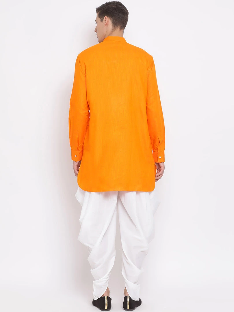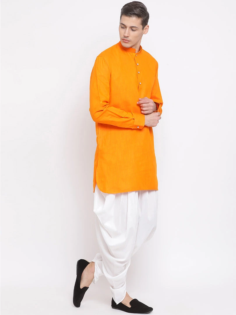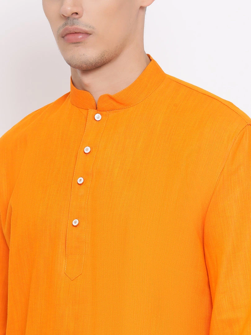 Orange solid above knee length pathani kurta, has a mandarin collar, long sleeves with cuffs, button placket, curved hem and side slits