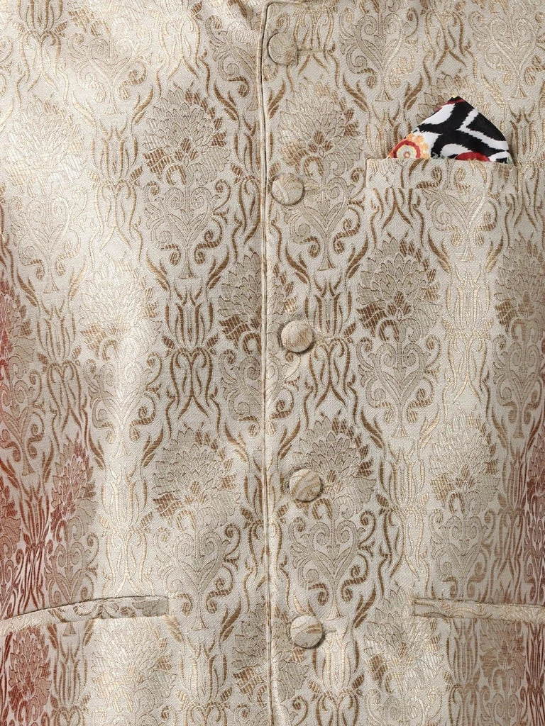 Beige and gold-toned woven Nehru jacket, has a mandarin collar, sleeveless, three pockets one with a pocket square