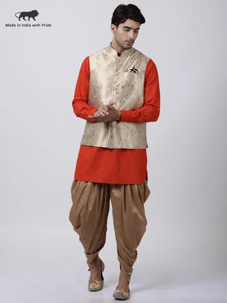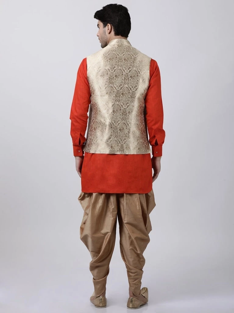 Orange solid kurta with solid dhoti pant and beige Nehru jacket