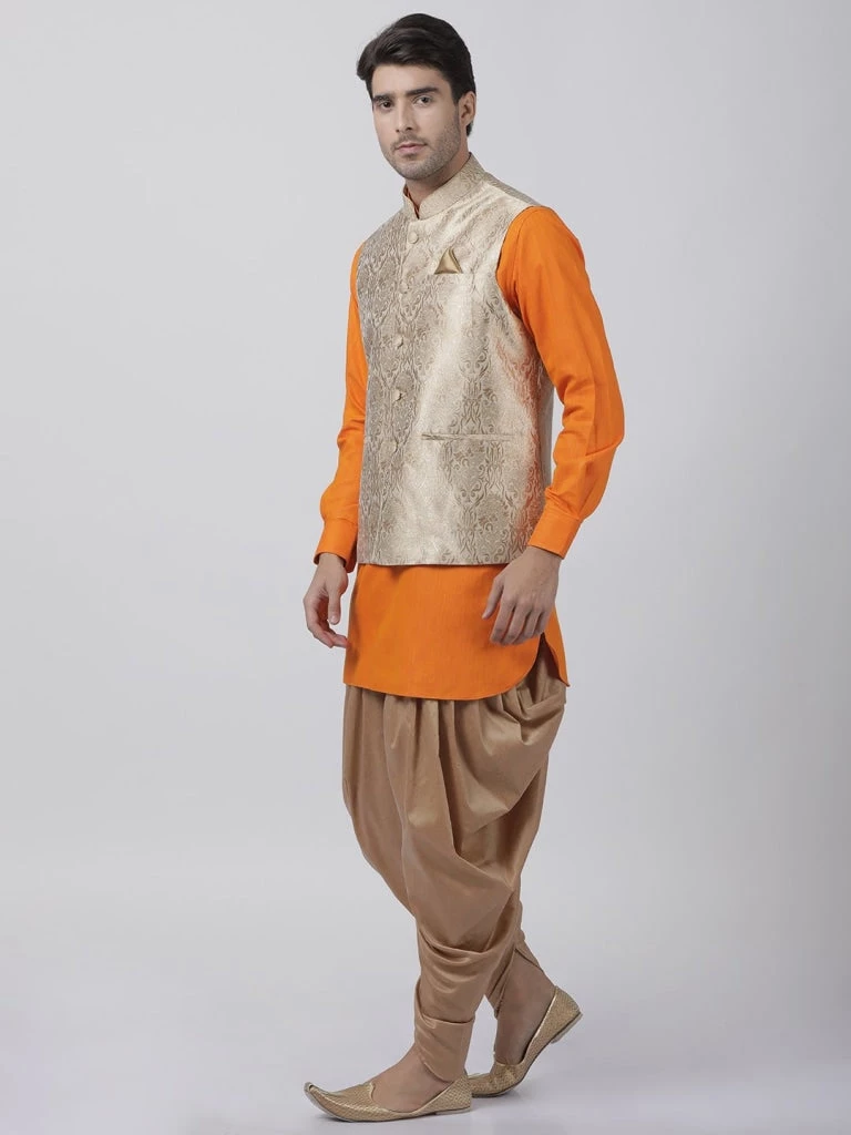 Orange solid kurta with solid dhoti pant and beige Nehru jacket