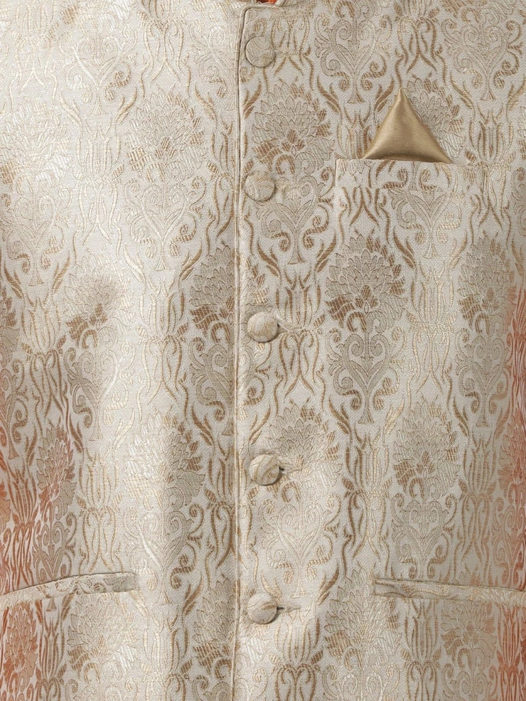 Beige and gold-toned woven Nehru jacket has a mandarin collar, sleeveless, three pockets one with a pocket square