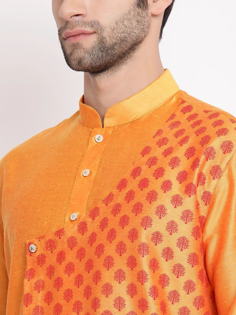 Orange Printed layered straight knee length kurta, has a mandarin collar, button placket, long sleeves, asymmetric hem.