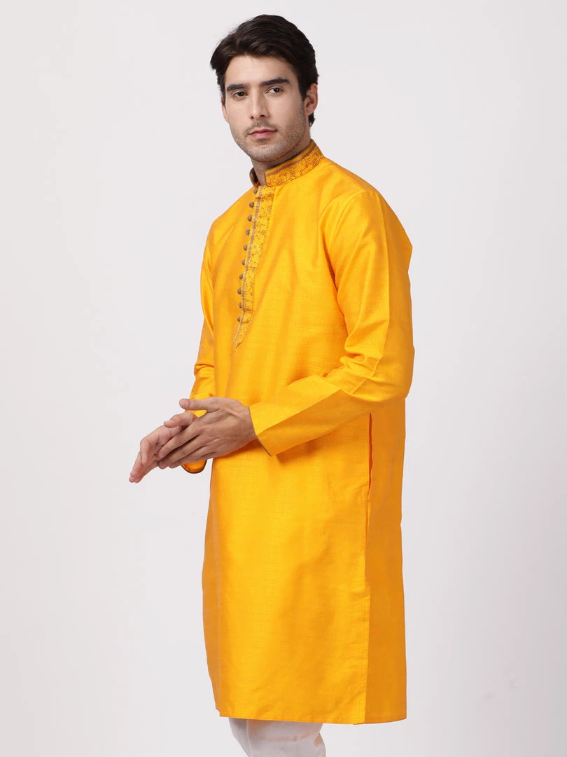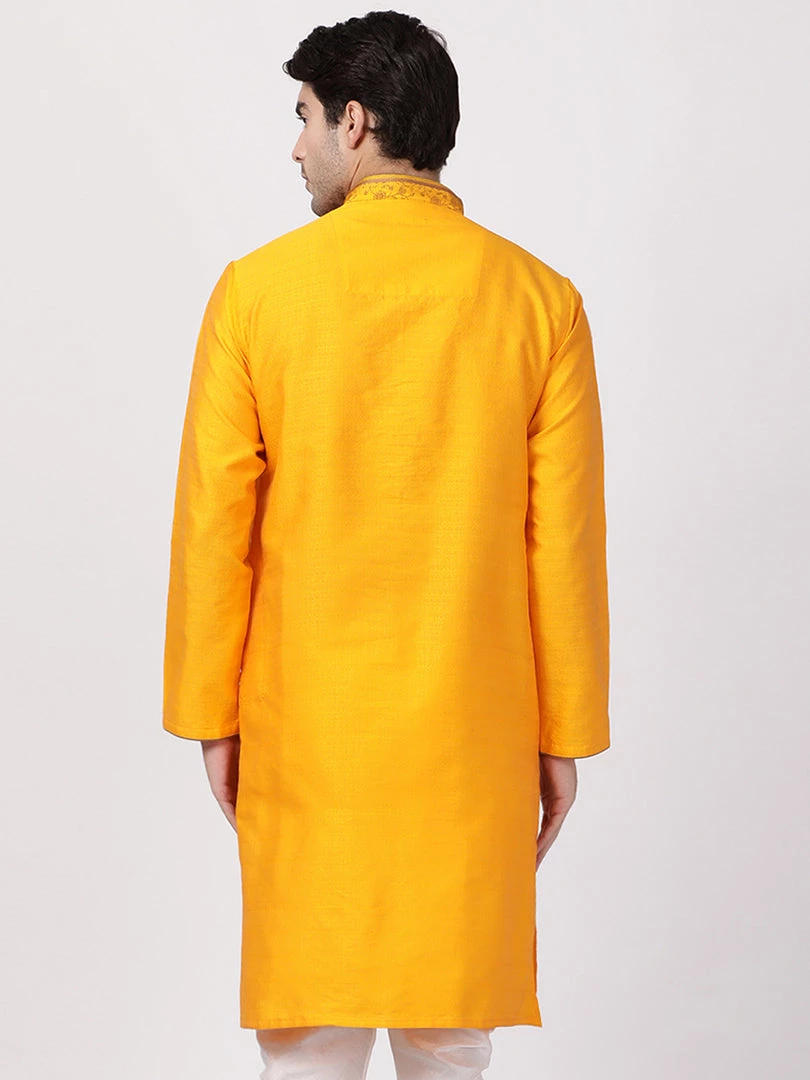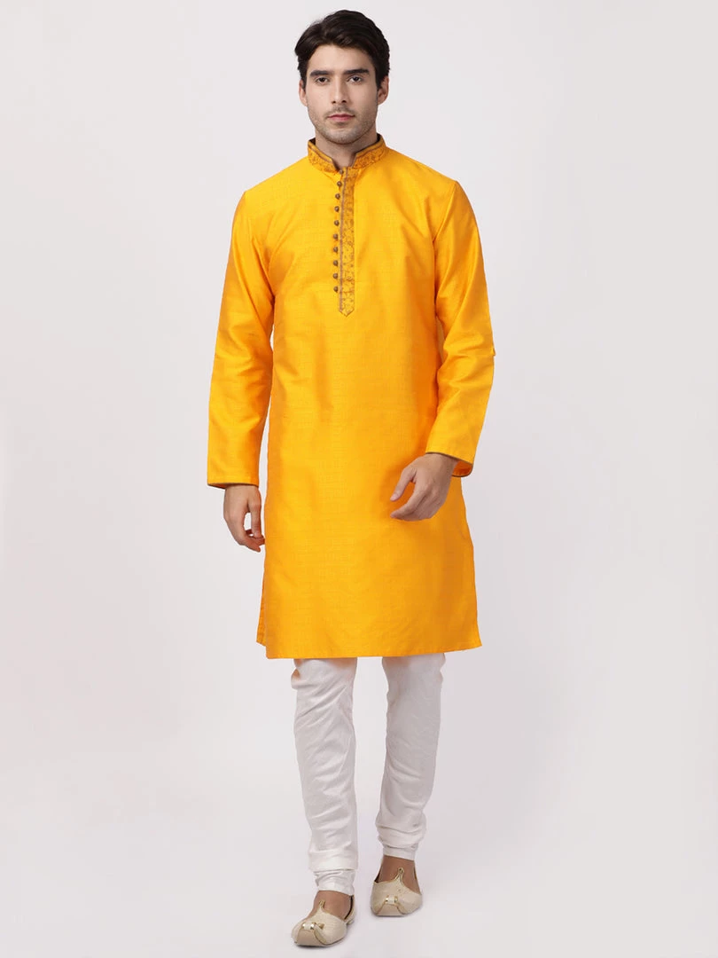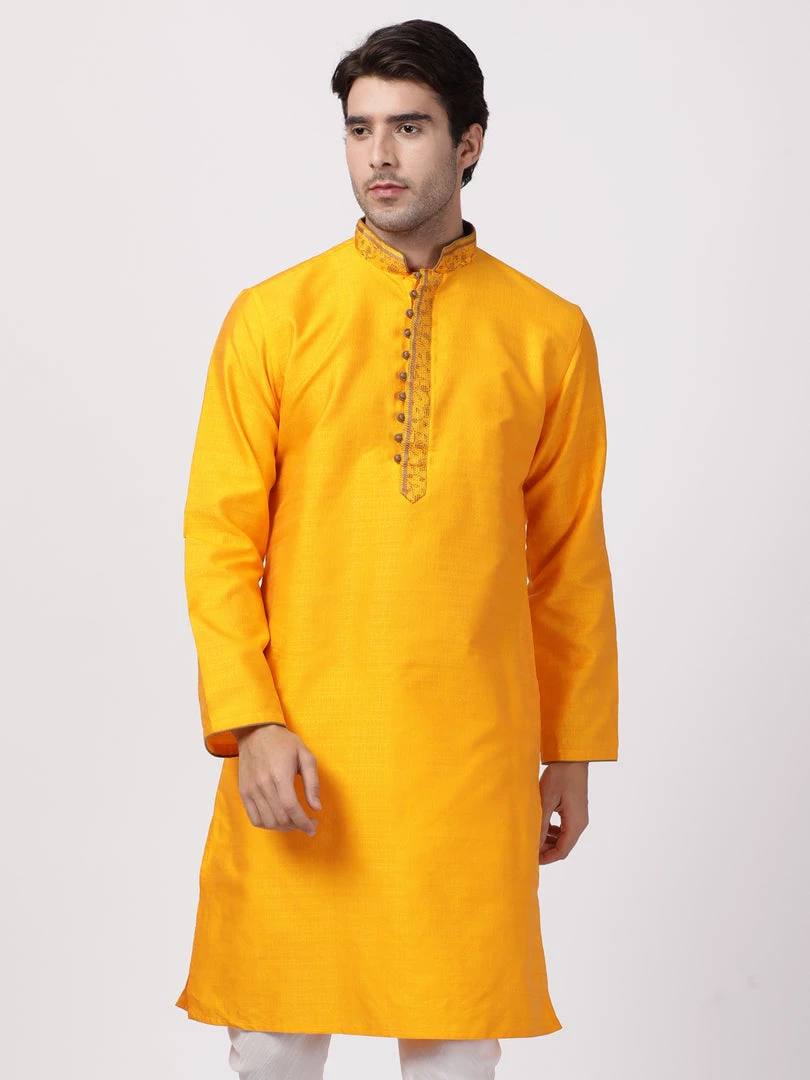 Orange solid kurta has sleeveless, straight hem mandarin collar, side slits, straight knee-length.