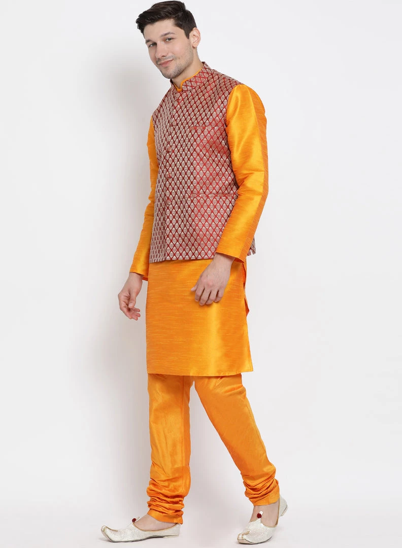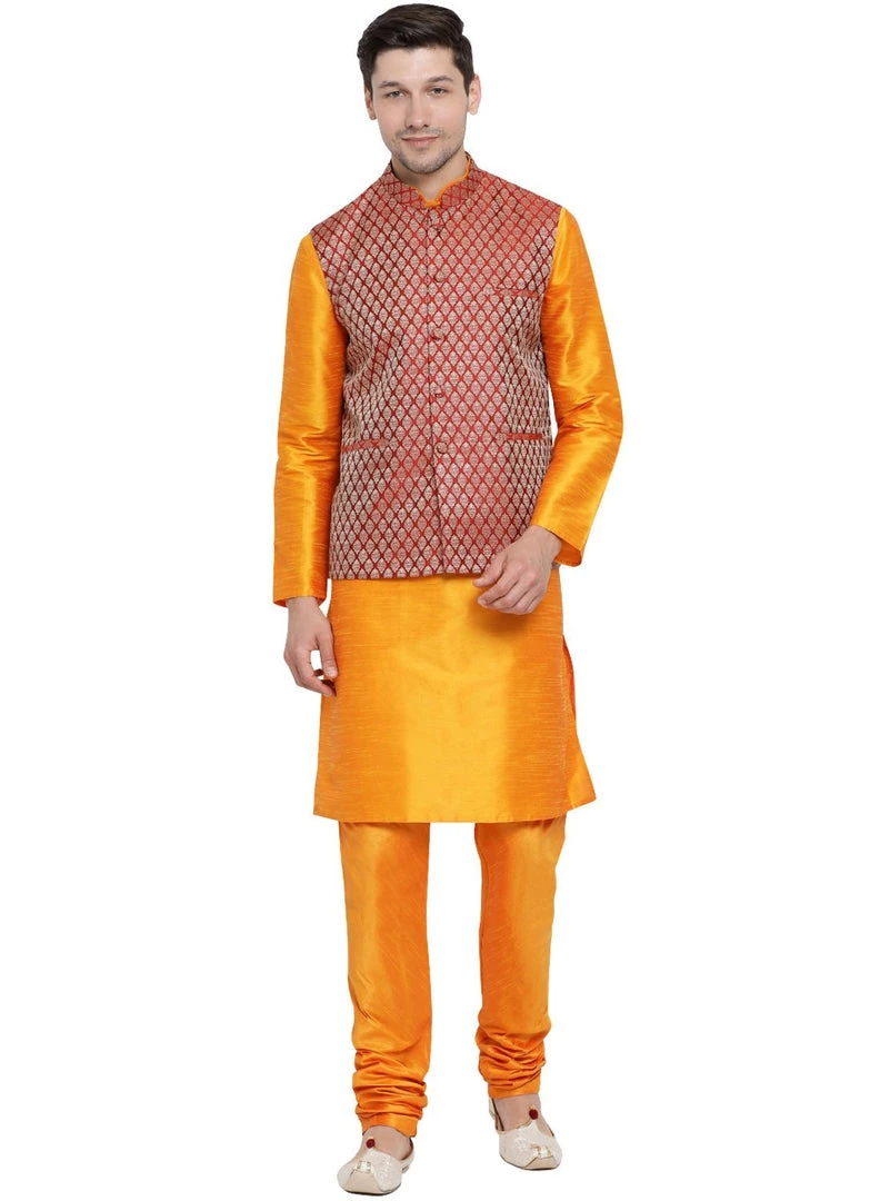 Orange solid kurta with solid churidar and woven Nehru jacket