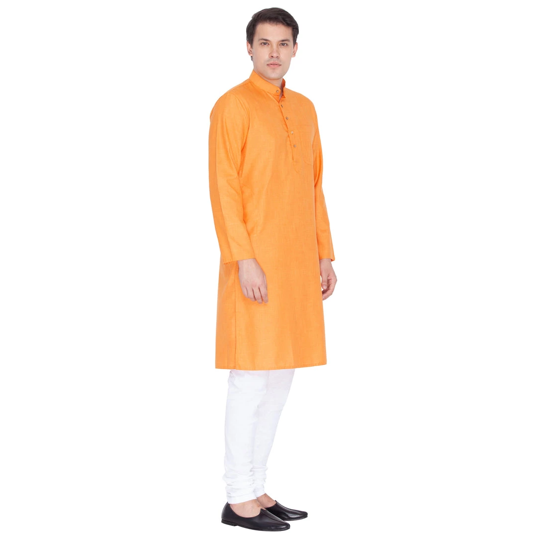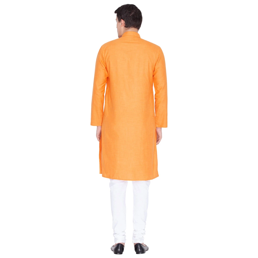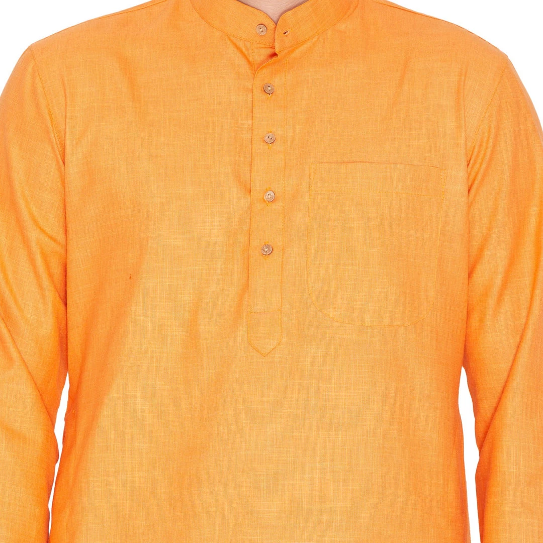 Orange straight knee length kurta, has a mandarin collar, long sleeves, button placket, straight hem