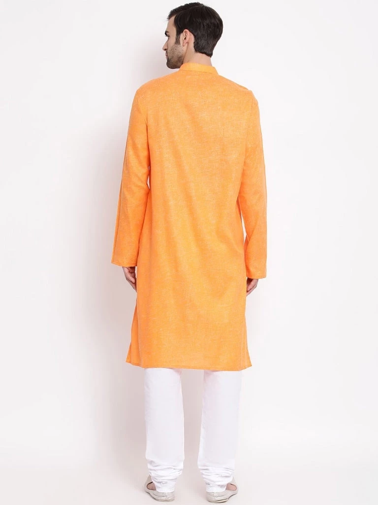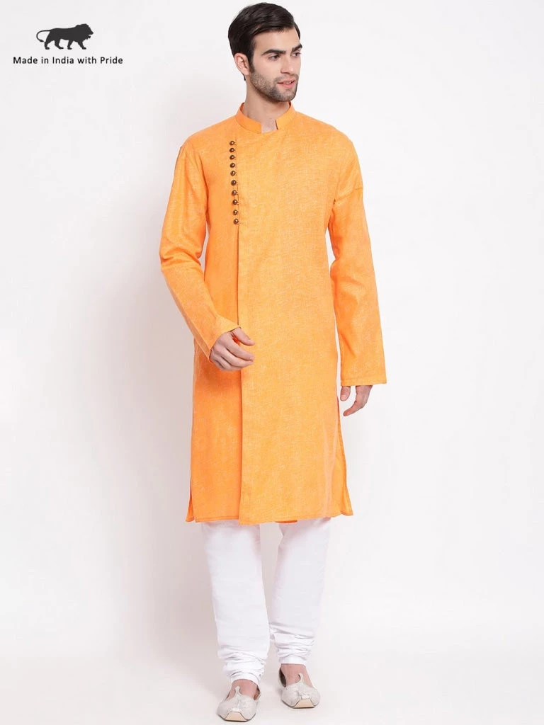 Orange angrakha style straight knee length kurta, has a mandarin collar, long sleeves, straight hem.