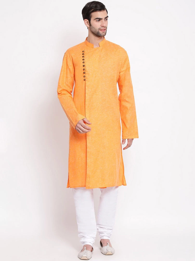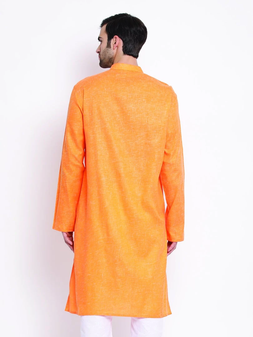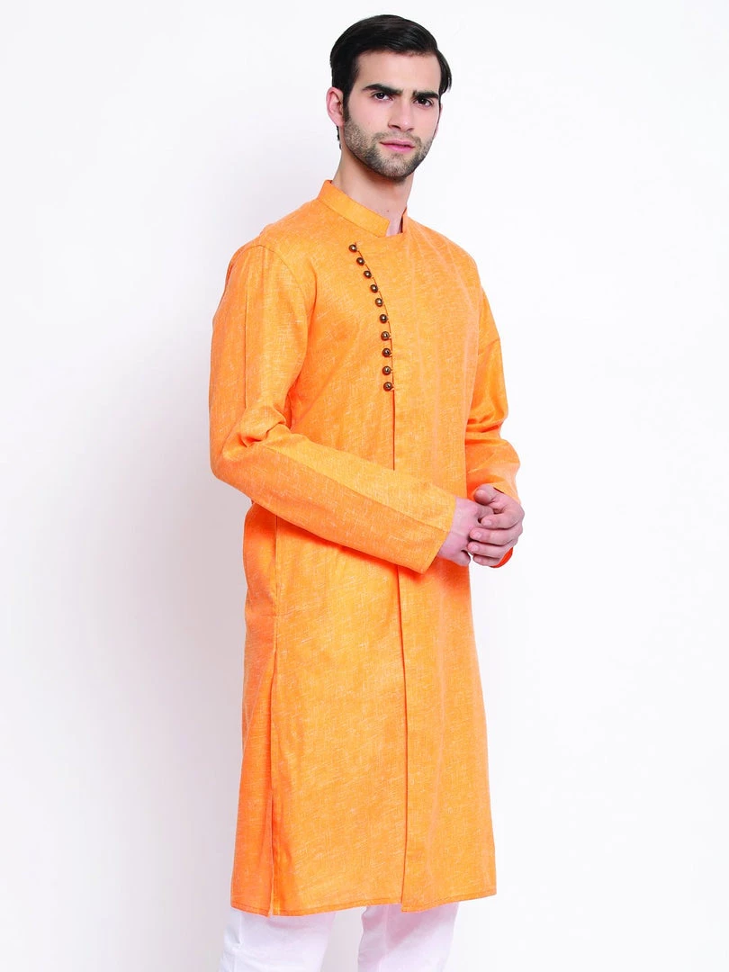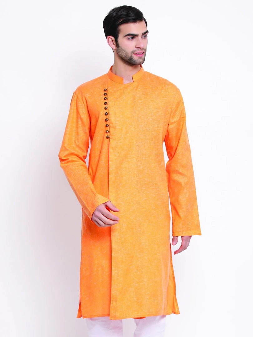 Orange angrakha style straight kurta, has a mandarin collar, long sleeves, straight hem, and side slits.
