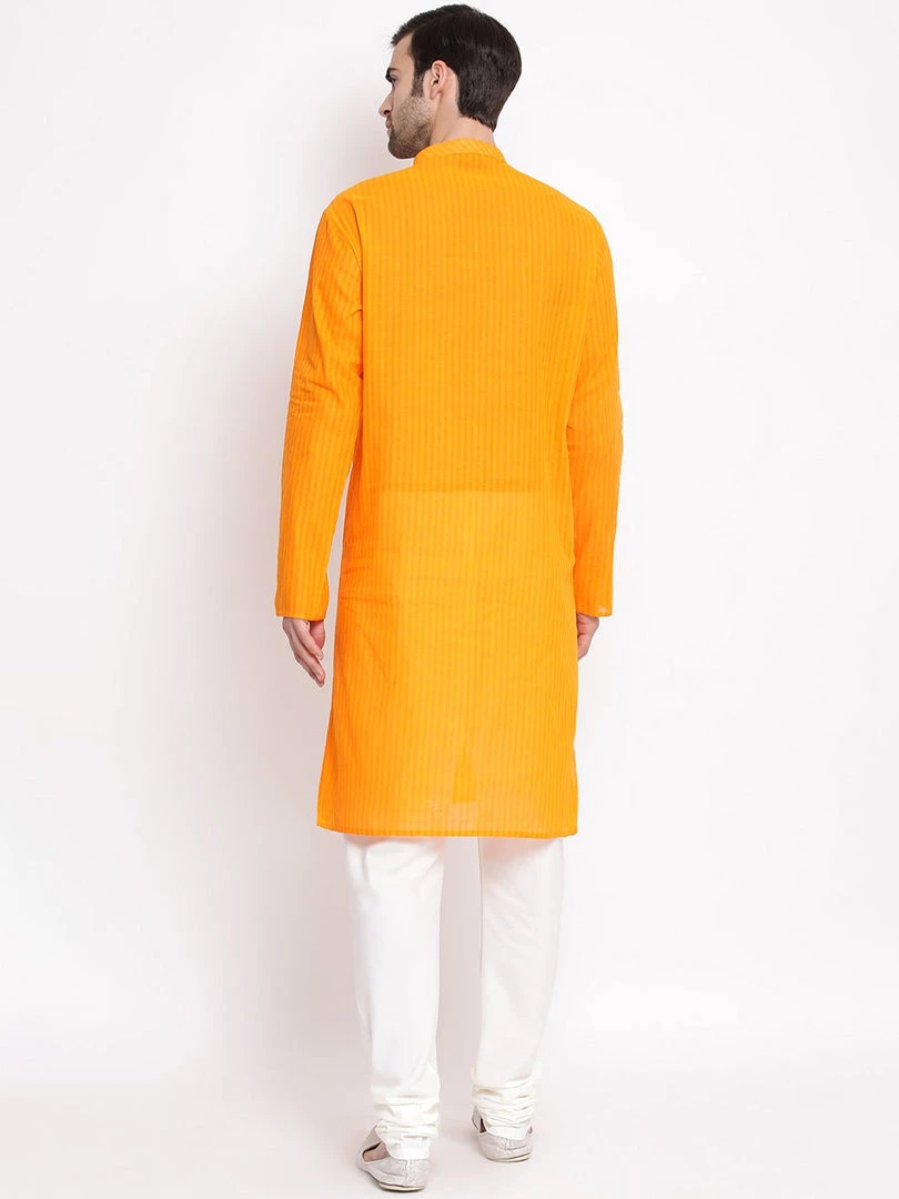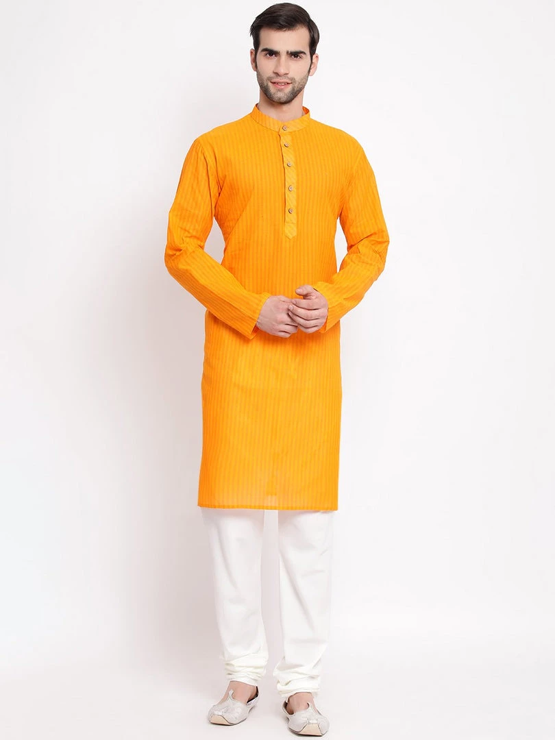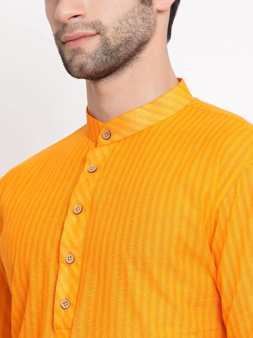 Orange and yellow stripe woven straight knee length kurta, has a mandarin collar, long sleeves, button placket, straight hem.