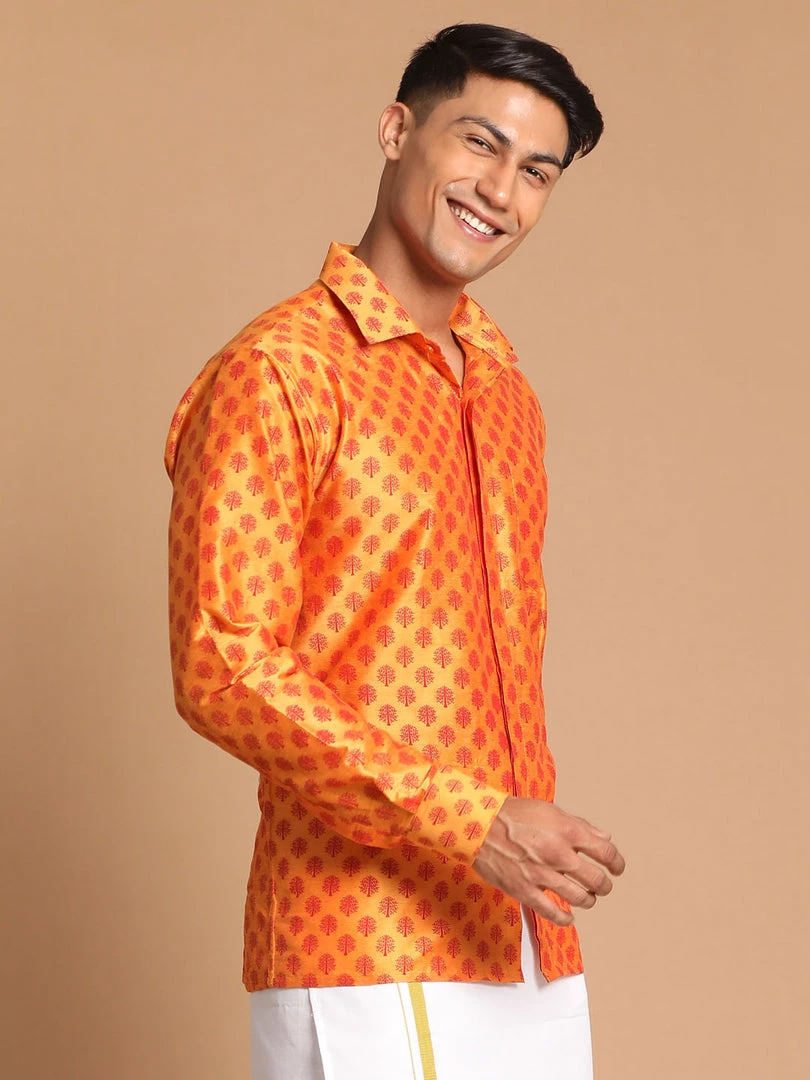 Orange printed casual shirt, has a shirt collar, long sleeves, straight hem, one patch pocket