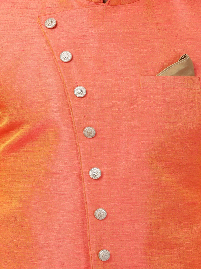 Orange solid sherwani, has a mandarin collar, a stylized curved button placket, long sleeves, a welt pocket, straight hem, side slits, an attached lining. Comes with pocket square.