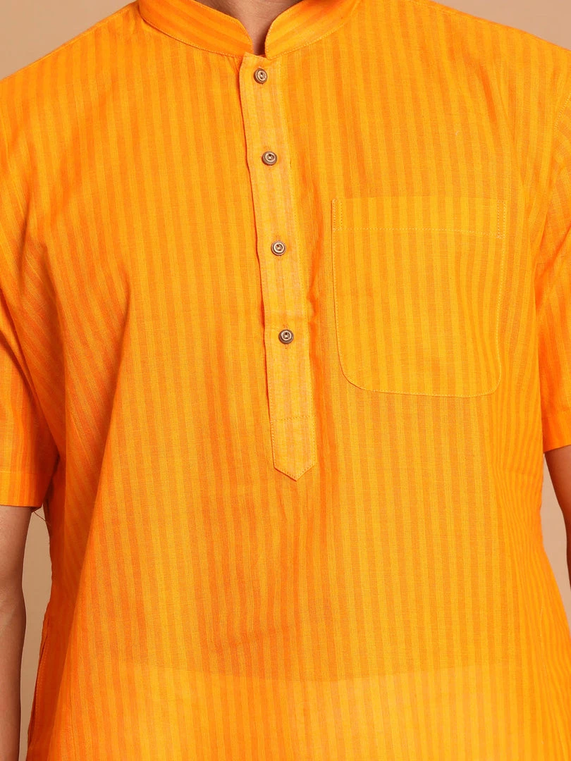 Orange striped cotton straight knee length kurta, has a mandarin collar, button placket, short sleeves, straight hem, and side slits. Comes with a white solid pant style pyjamas, has a elasticated waistband.