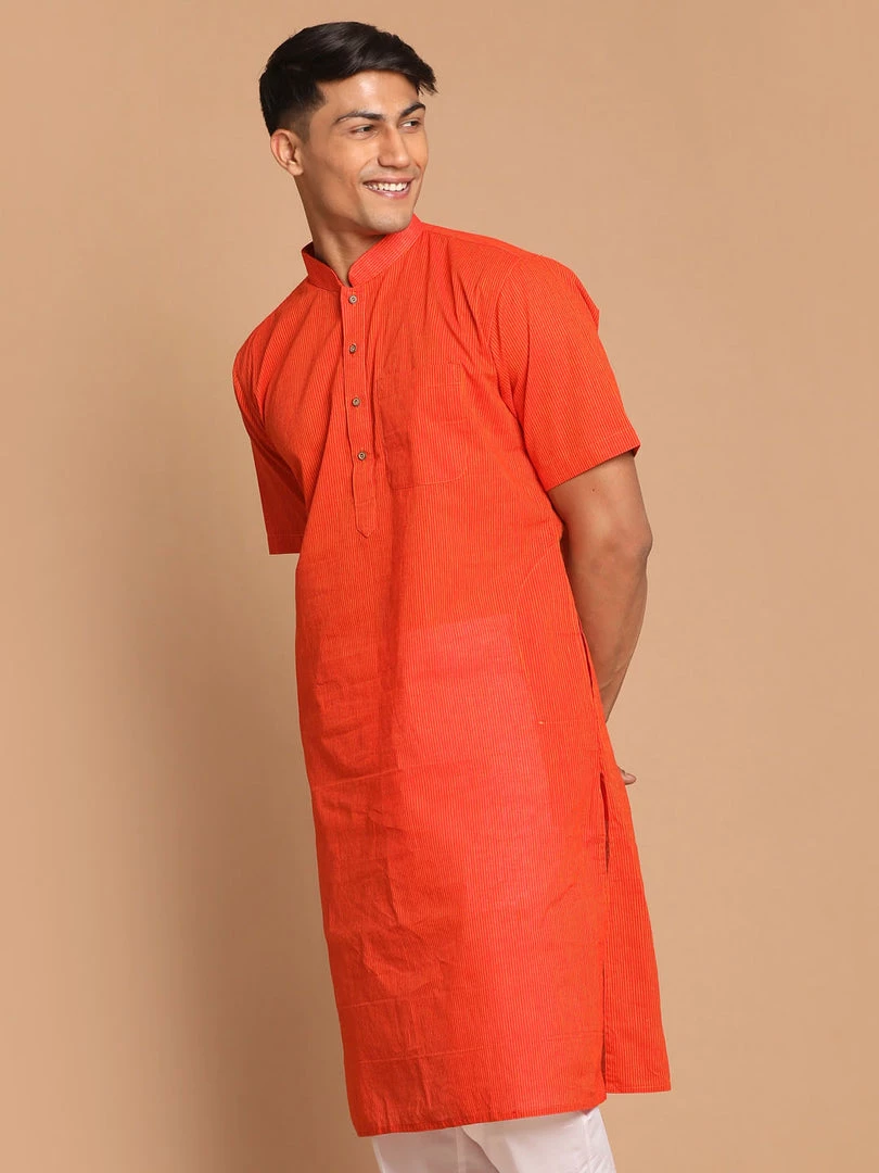 Orange striped pure cotton handloom straight knee length kurta, has a mandarin collar, button placket, short sleeves, straight hem, one patch pocket and side slits.
