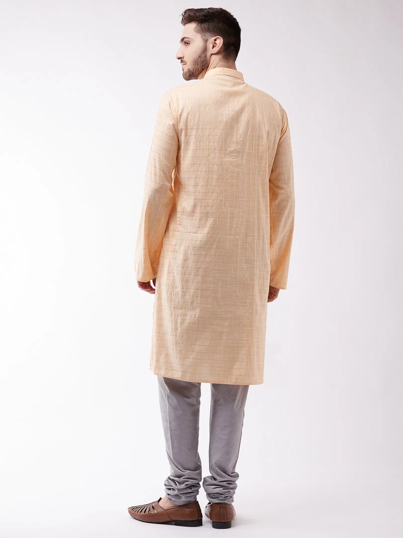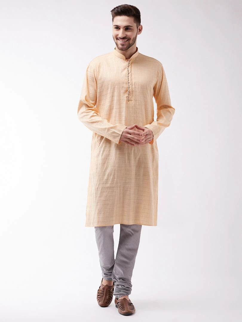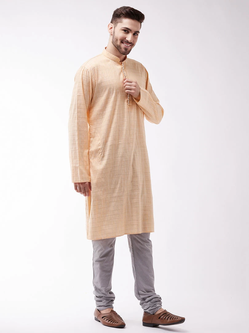Peach cotton blend woven straight knee-length kurta, has a mandarin collar, button placket, long sleeves, straight hem, and side slits. Comes with a grey solid churidar, has a drawstring closure.