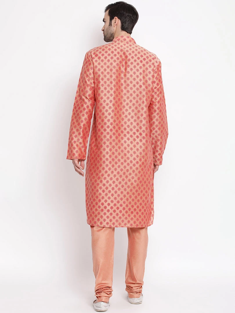 Peach Printed straight Knee length kurta, has a Mandarin Collar, button placket, long sleeves, Straight hem, Side slits.