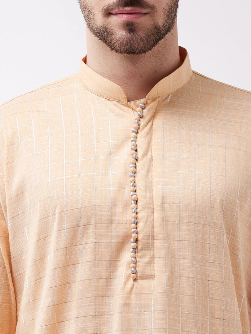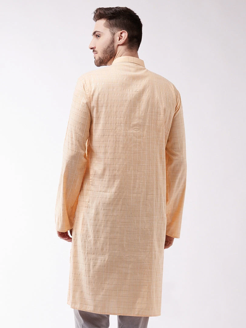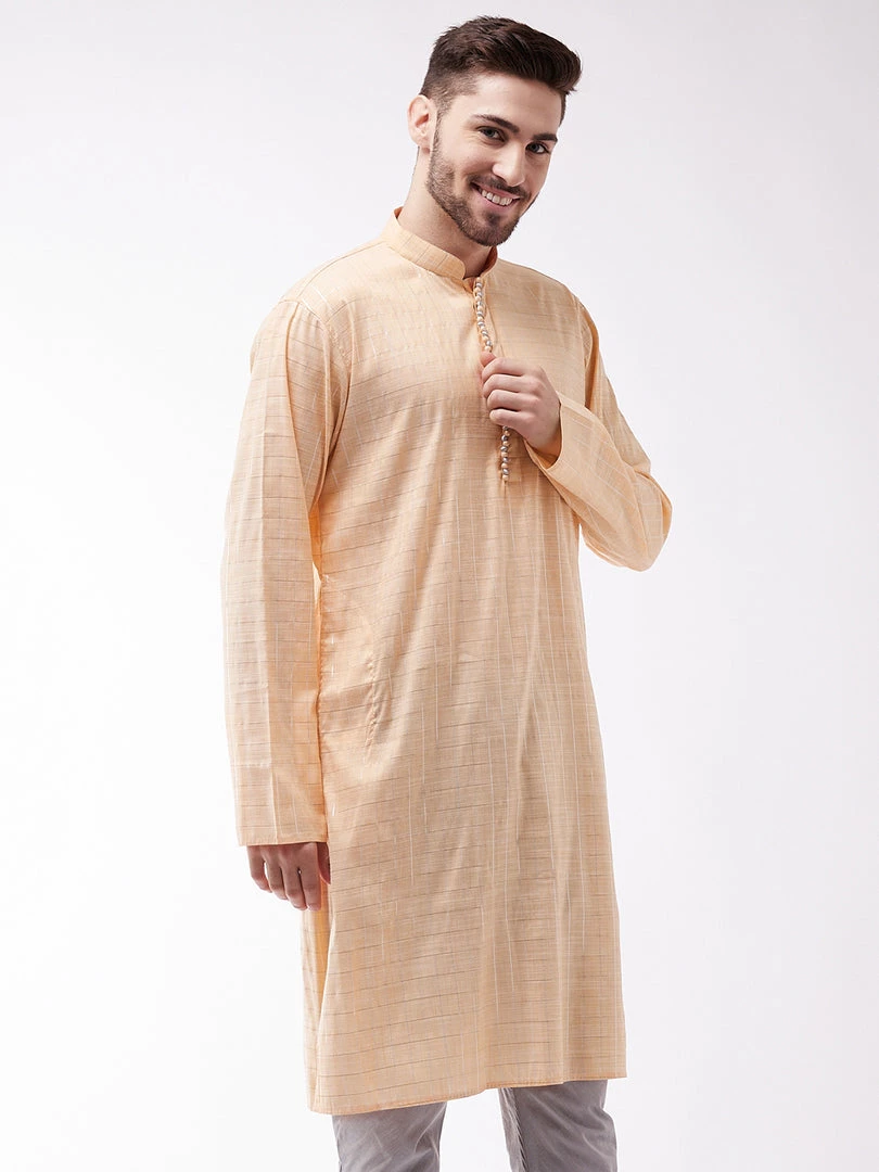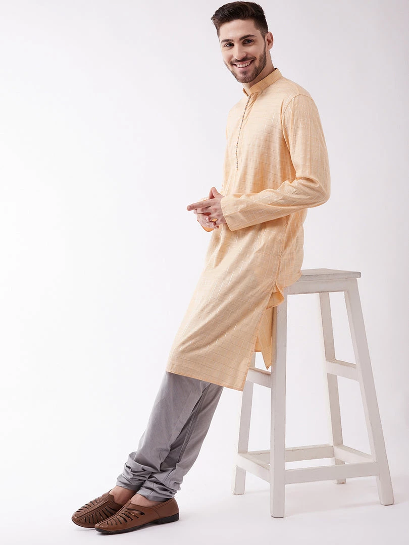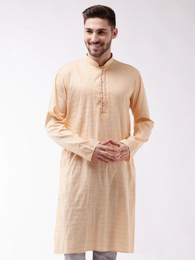 Cotton Blend Fabric Fluid Kurta With Silver Zari Check Weave, has a mandarin collar, long sleeves, a straight hem, and side slits.