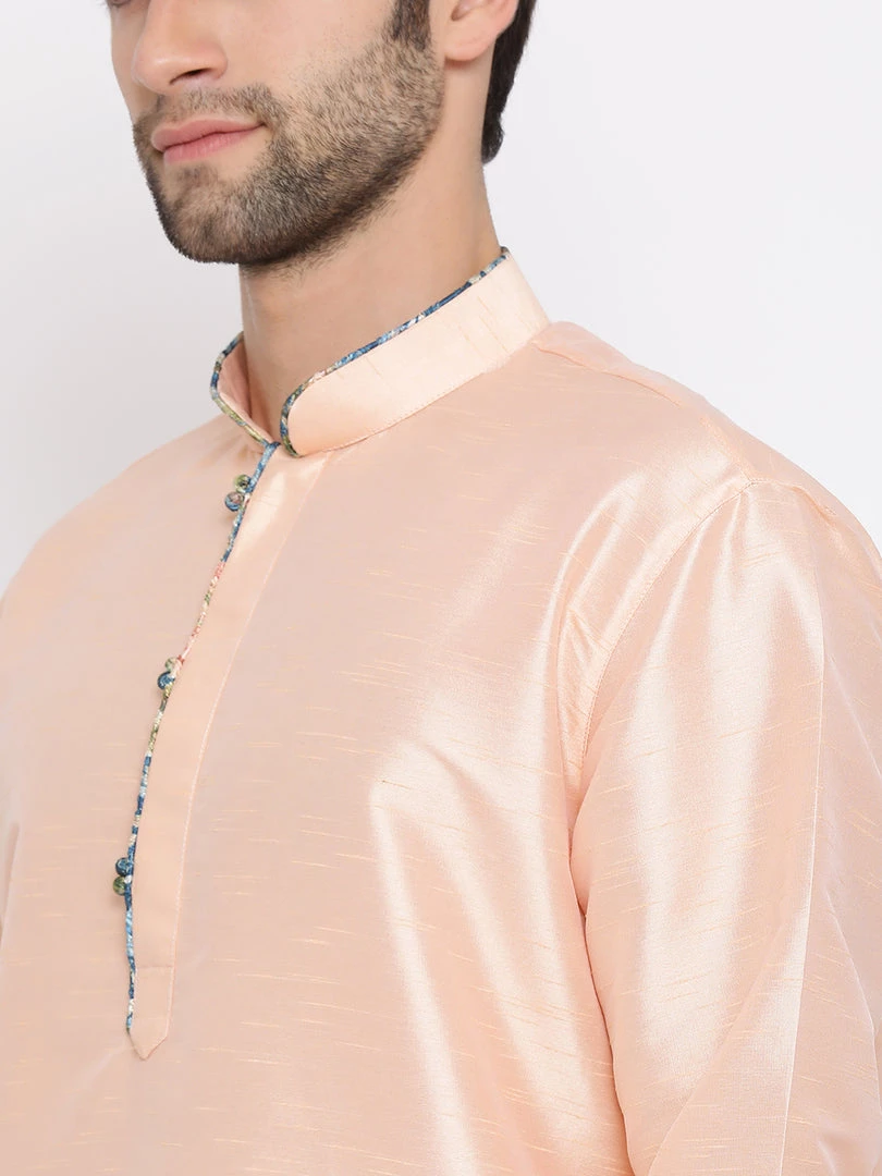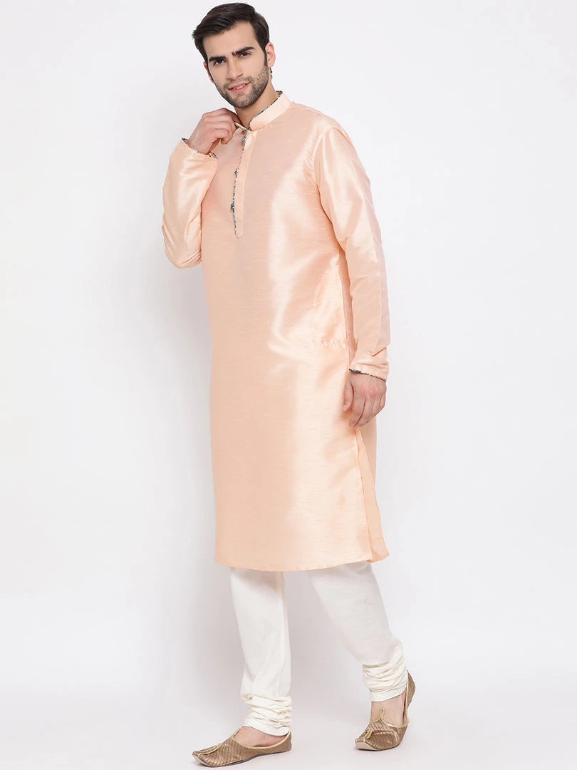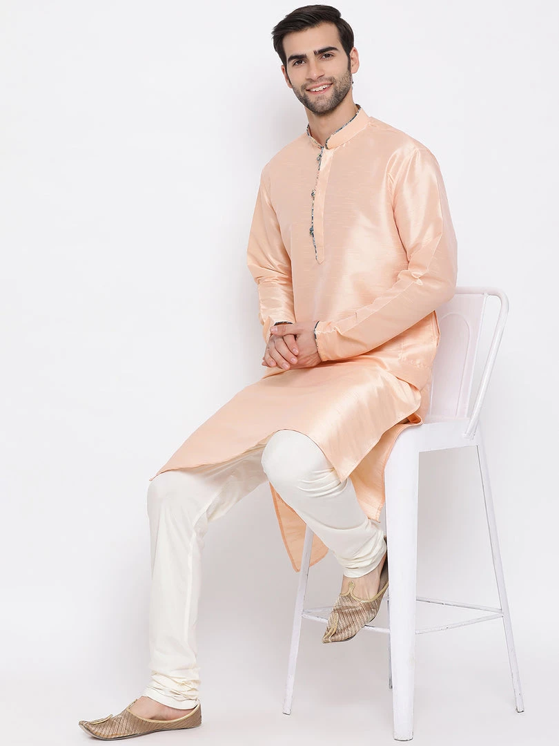 Peach solid straight knee length kurta, has a mandarin collar, long sleeves, button placket, straight hem.