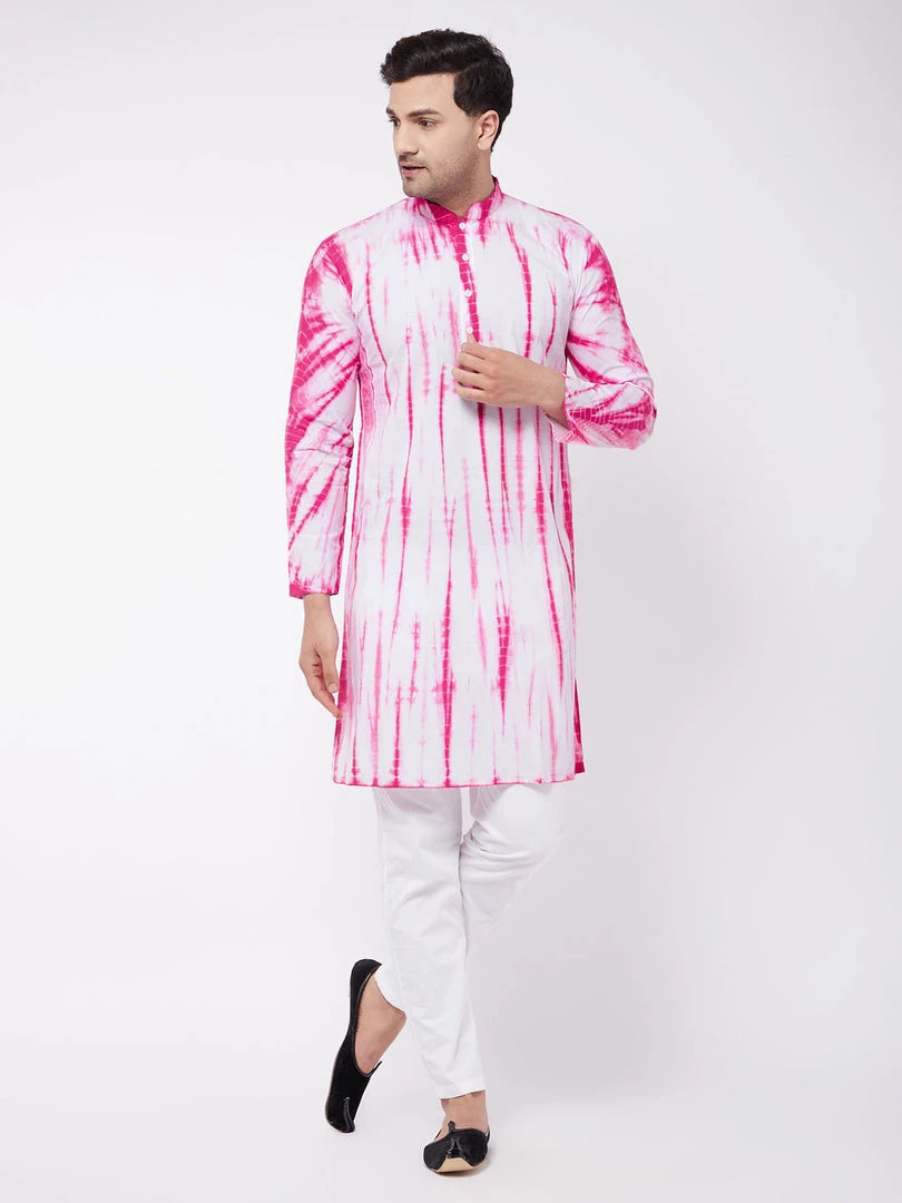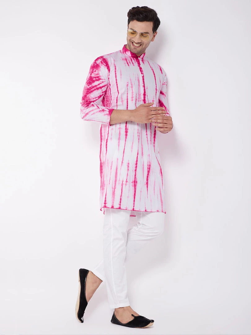 Pink and white tie-dye straight cotton knee-length kurta, has a mandarin collar, button placket, long sleeves, straight hem, and side slits.