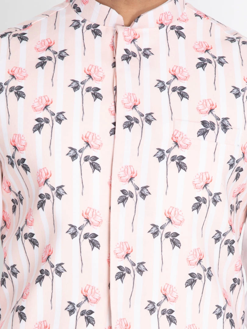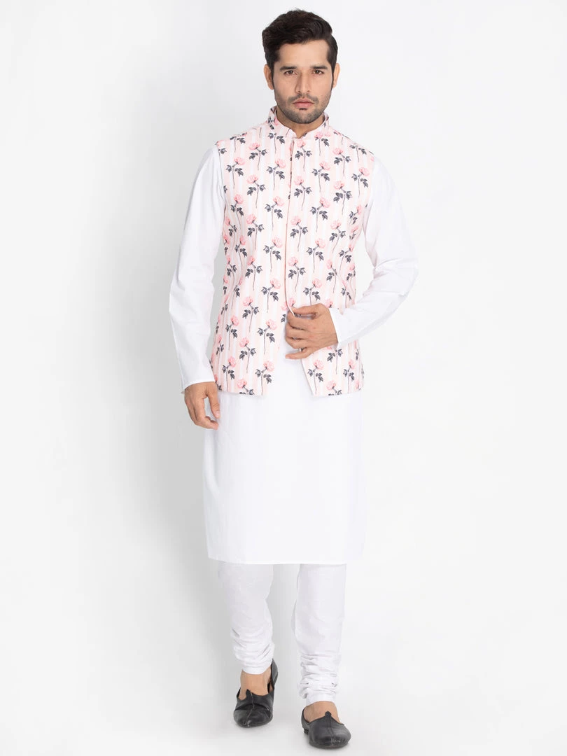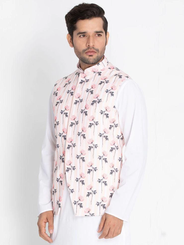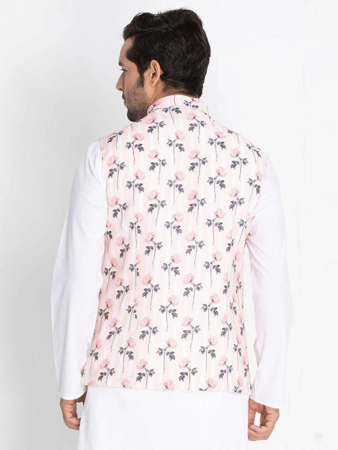 Pink Woven Floral Nehru jacket, Sleeveless, Straight hem, has a Mandarin Collar, has One pocket.