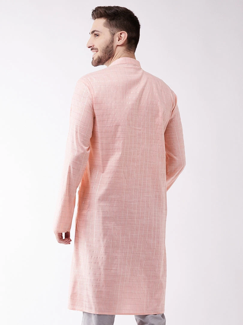 Cotton Blend Fabric Fluid Kurta With Silver Zari Check Weave, has a mandarin collar, long sleeves, a straight hem, and side slits.