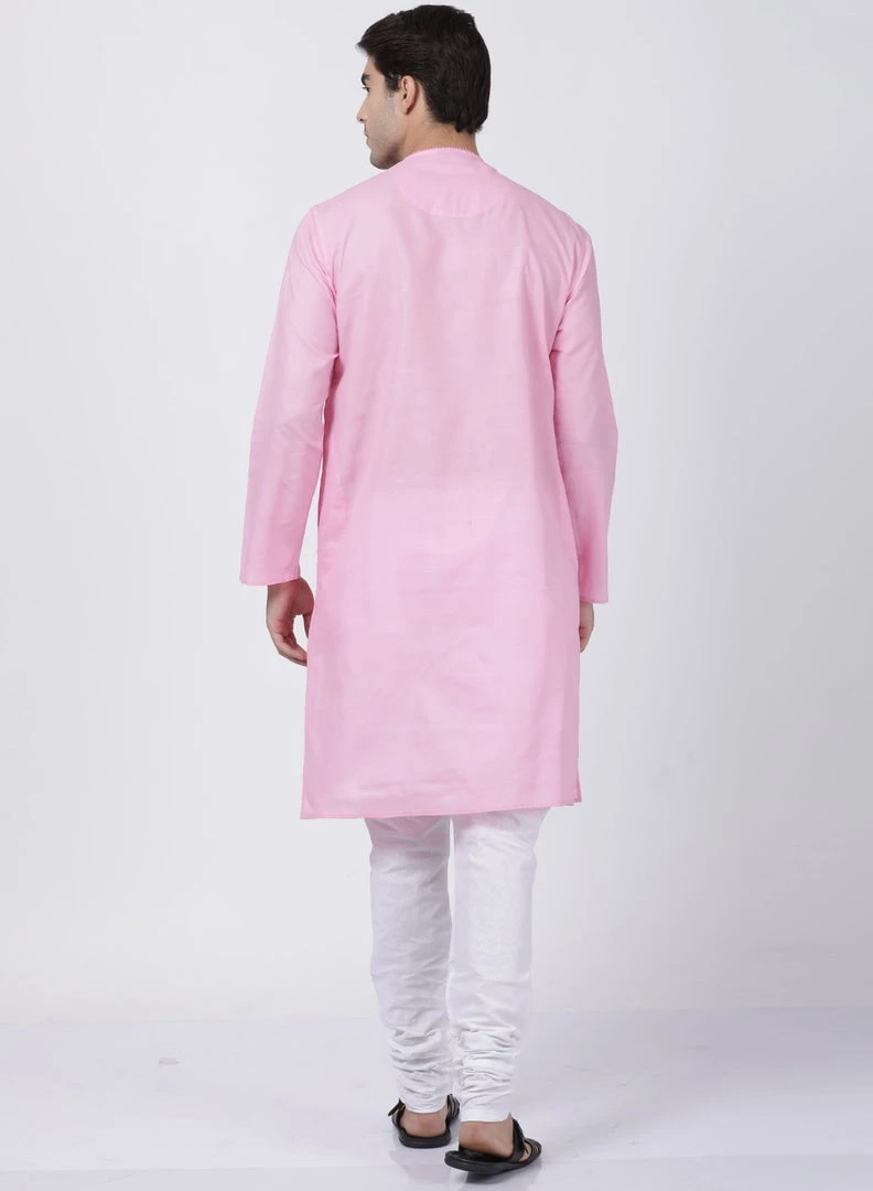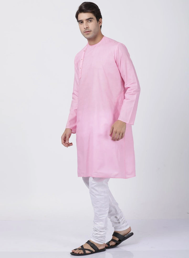Pink solid straight knee length kurta, has a round neck, side button placket, long sleeves, straight hem