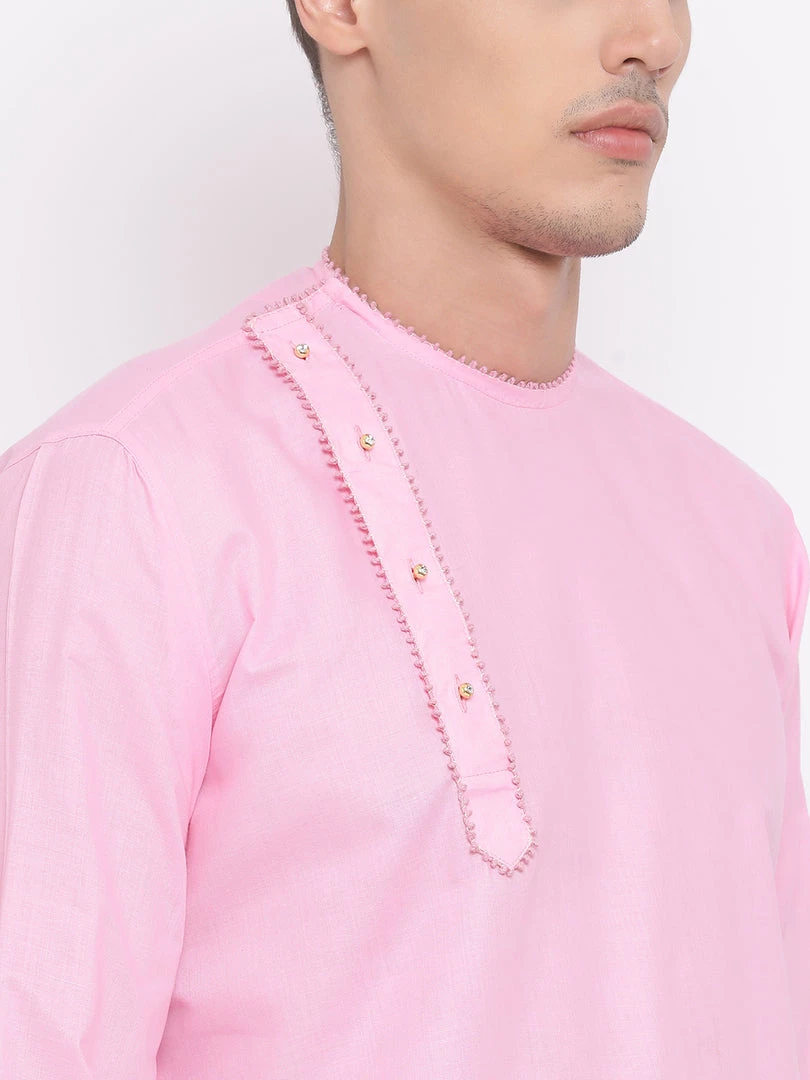 Pink solid knee length kurta, has a round neck, long sleeves, side button placket, straight hem, side slits