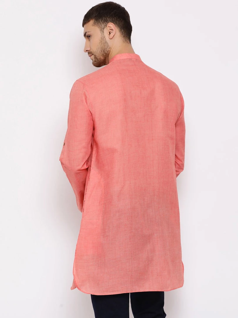 Pink short solid kurta, has a mandarin collar, long sleeves, curved hem, button placket and a pocket