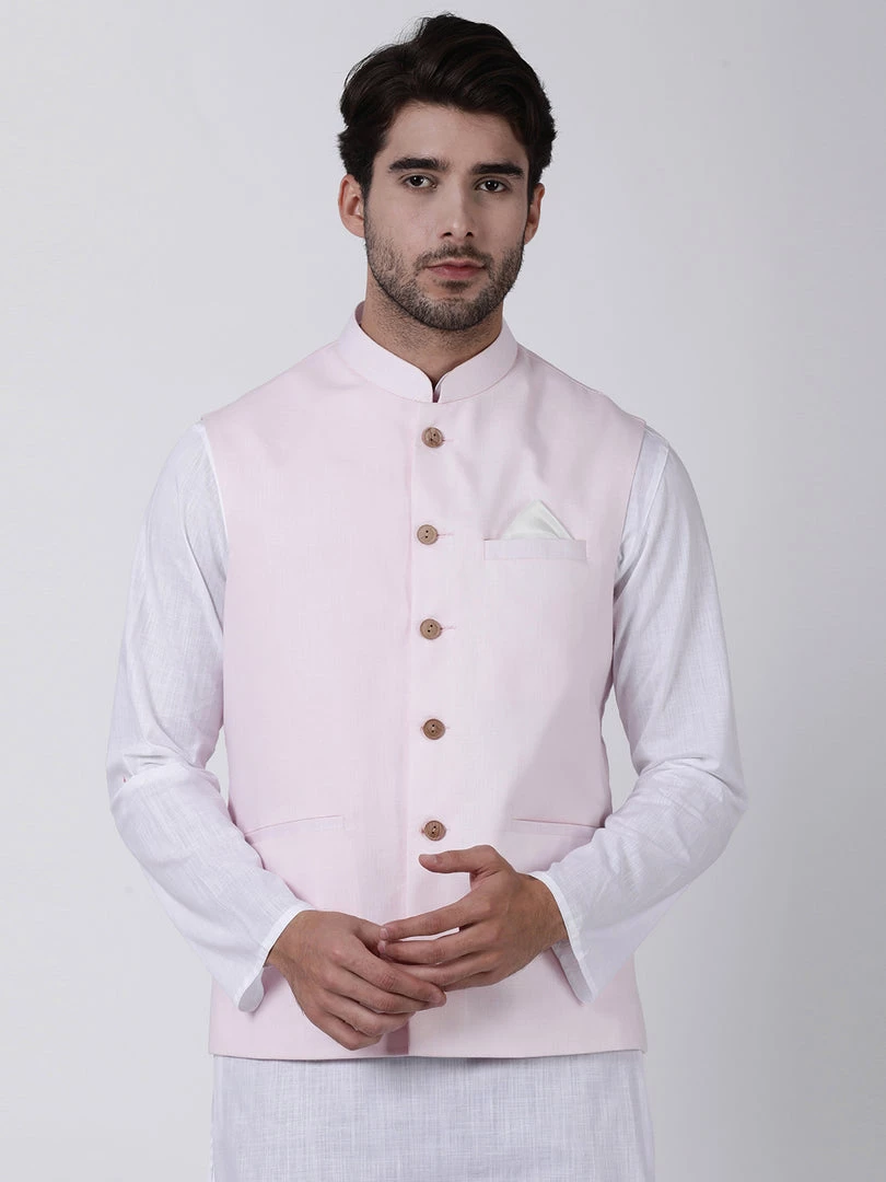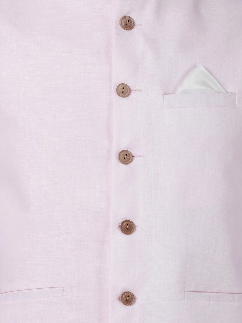 Pink solid Nehru jacket, has a mandarin collar, a full button placket, sleeveless, three welt pockets