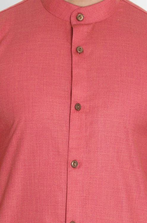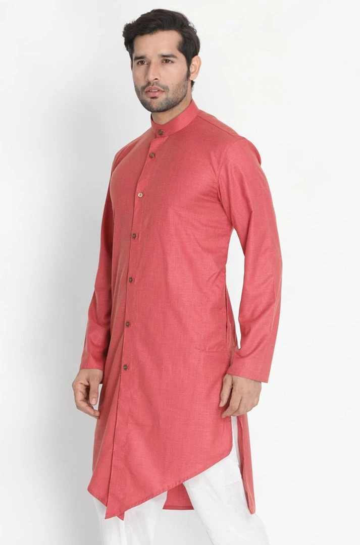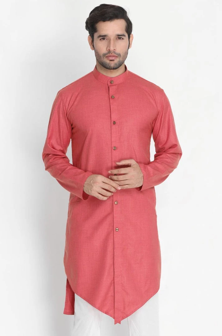 Pink solid straight kurta, has a mandarin collar, long sleeves, full front button placket, asymmetric hem, and side slits