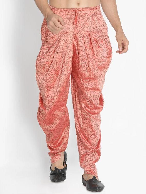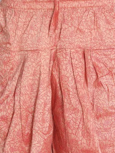 Pink geometric print dhoti pant with pleats forming cowl on sides, has an elasticated waistband with draw-string closure