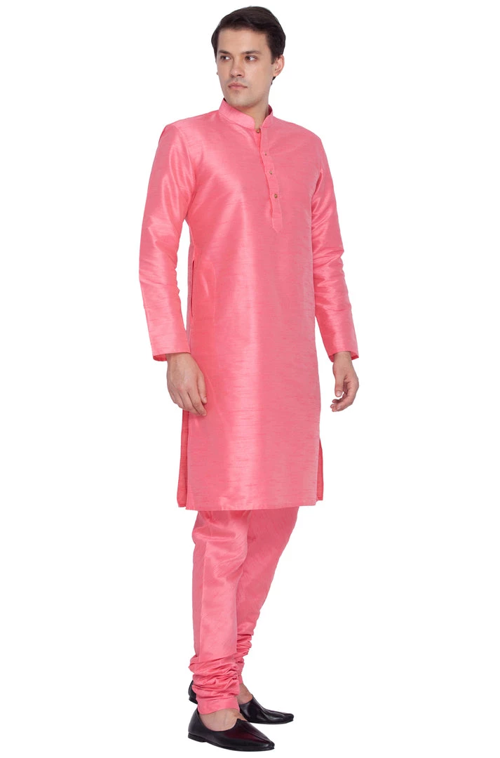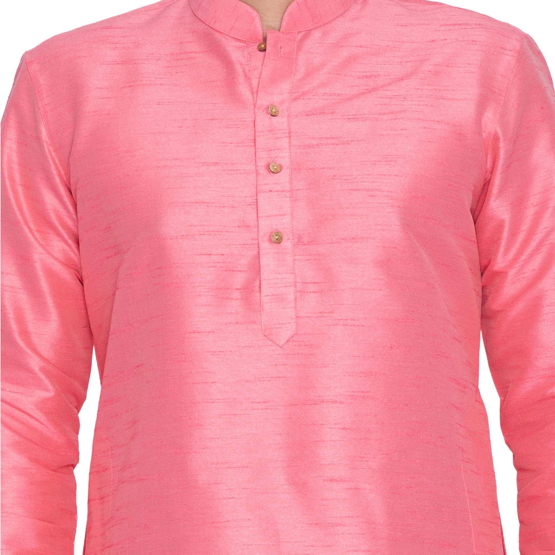 Pink solid straight knee length kurta, has a mandarin collar, button placket, long sleeves, straight hem