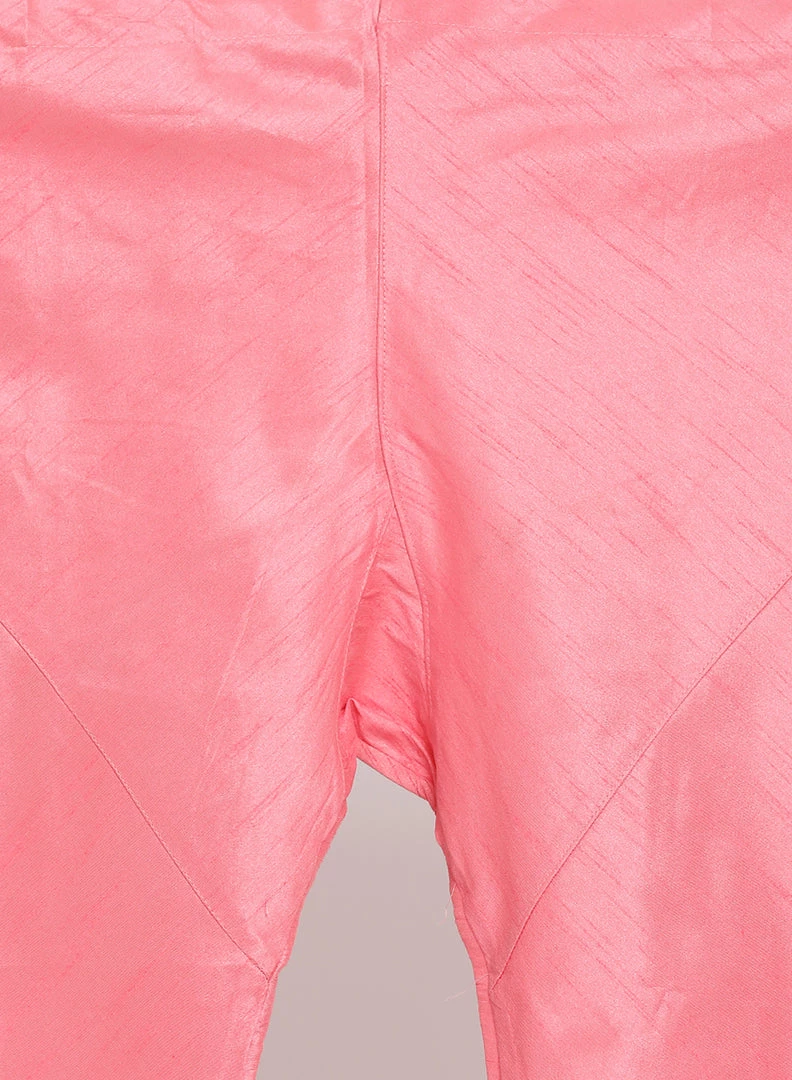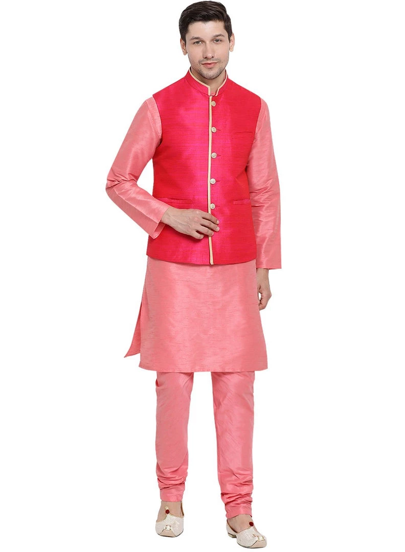 Pink Solid Nehru Jacket, Regular style, regular-length, has a Mandarin collar, sleeveless, straight hem, and has three pockets