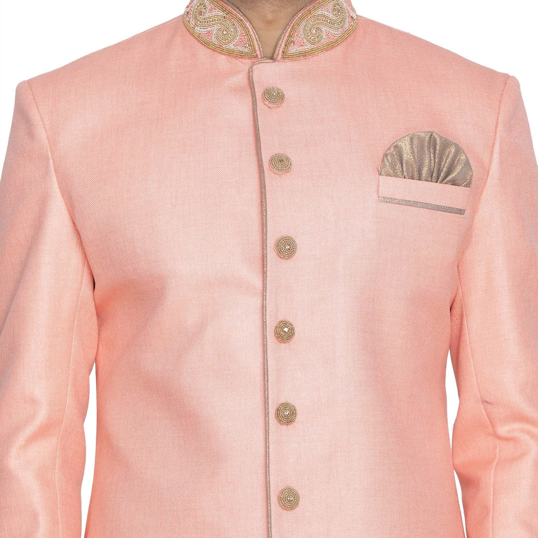 Pink solid sherwani, has a mandarin collar, a front button placket, long sleeves, embroidered details on collar, a welt pocket, straight hem, side slits, an attached lining. Comes with pocket square.