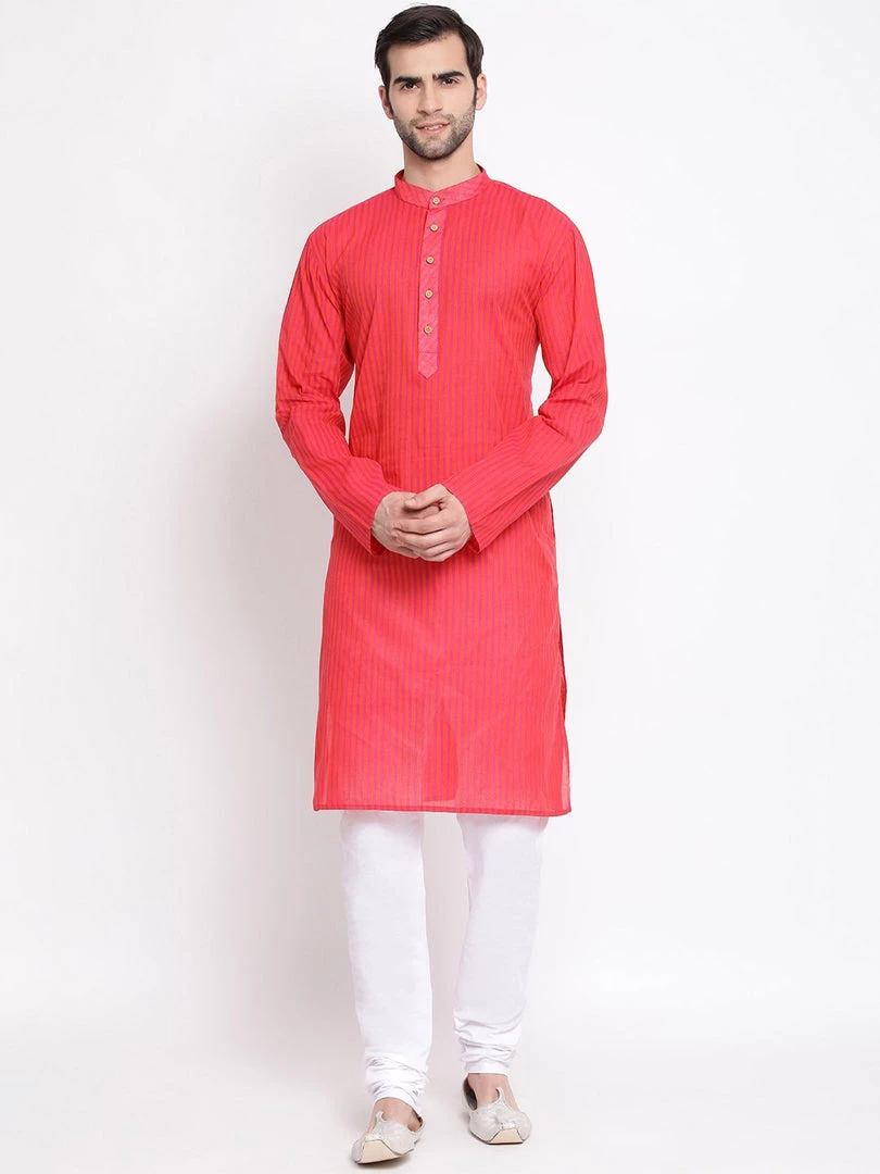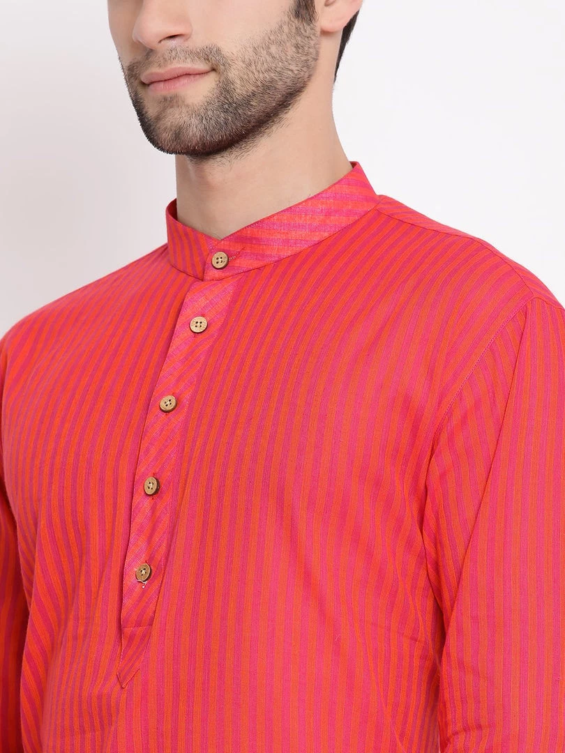 Pink and orange stripe woven straight knee length kurta, has a mandarin collar, long sleeves, button placket, straight hem.