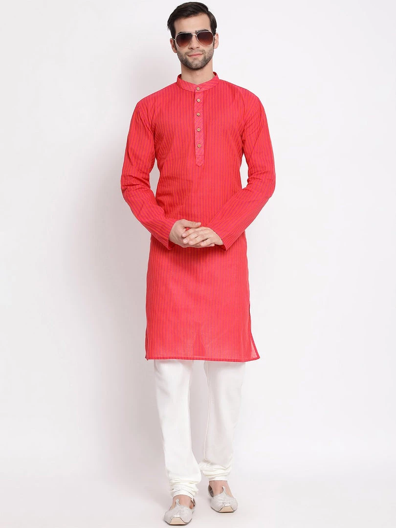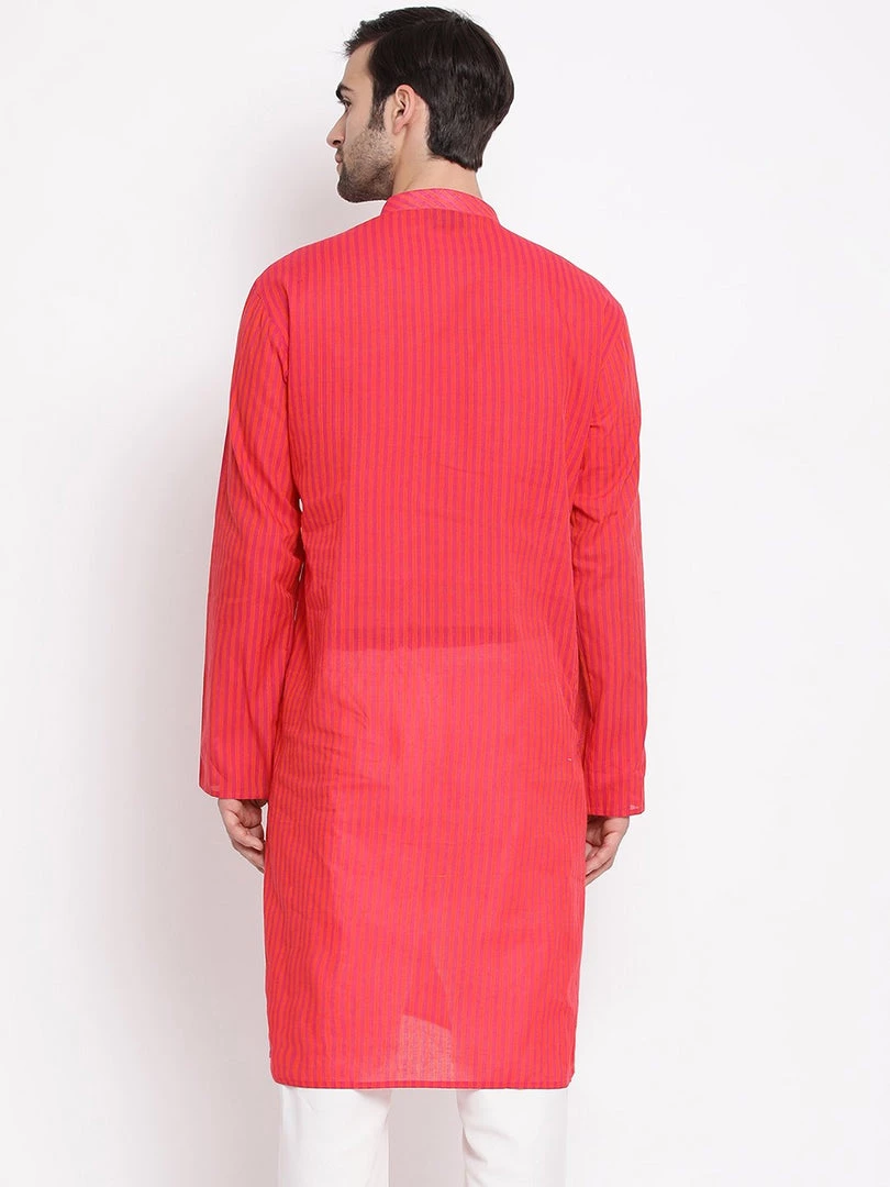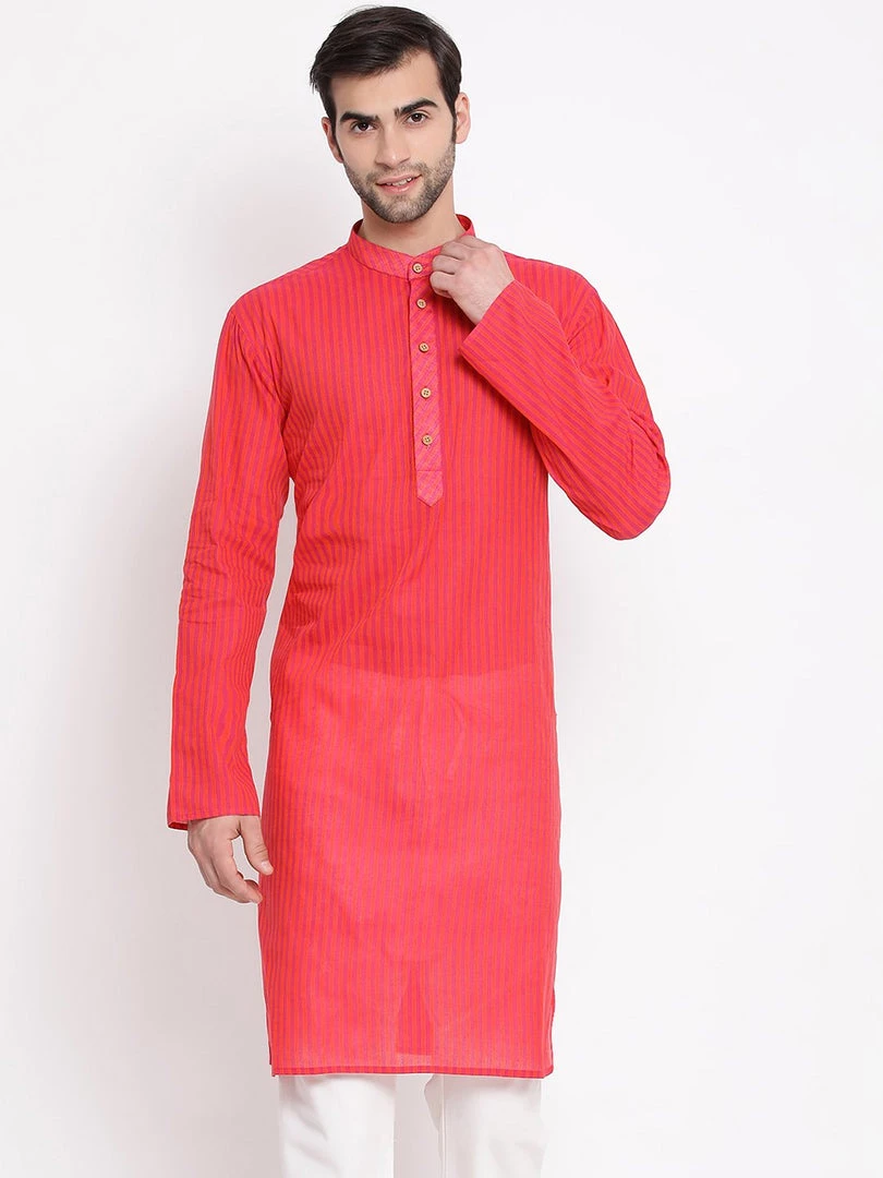 Pink and orange stripe straight kurta, has a mandarin collar, long sleeves, button placket, straight hem, and side slits.