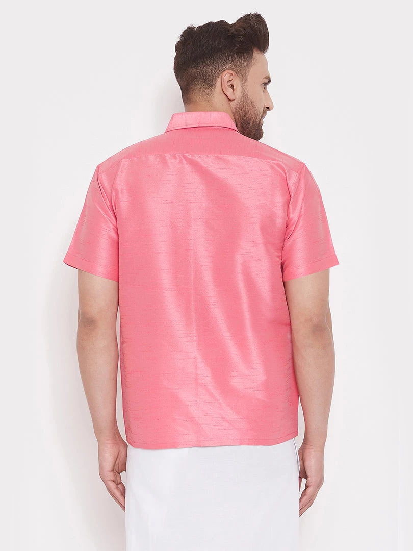 Pink solid casual shirt, has a shirt collar, short sleeves, straight hem, full button placket, one patch pocket