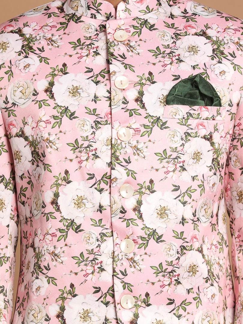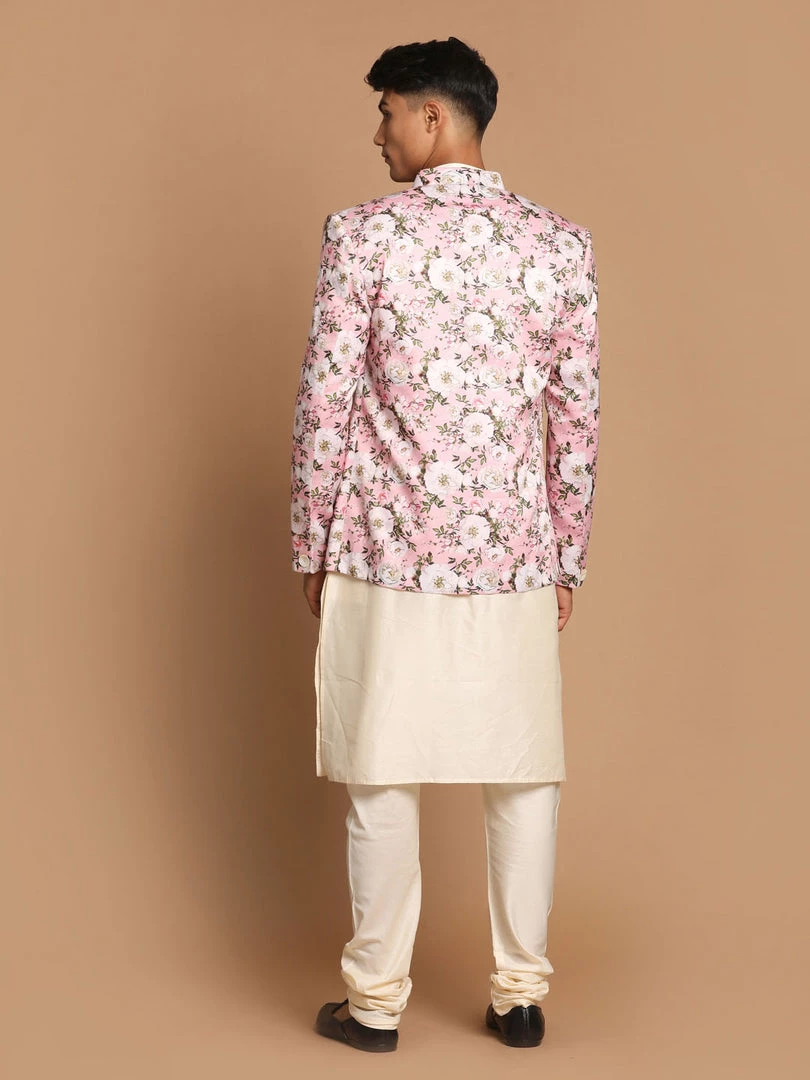 Pink floral print regular-fit jodhpuri with Cream coloured solid kurta and pajama.