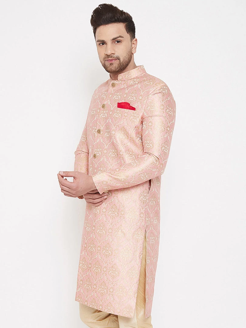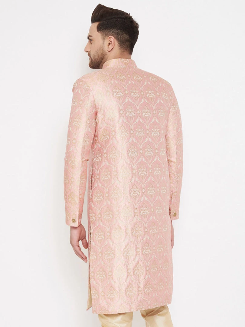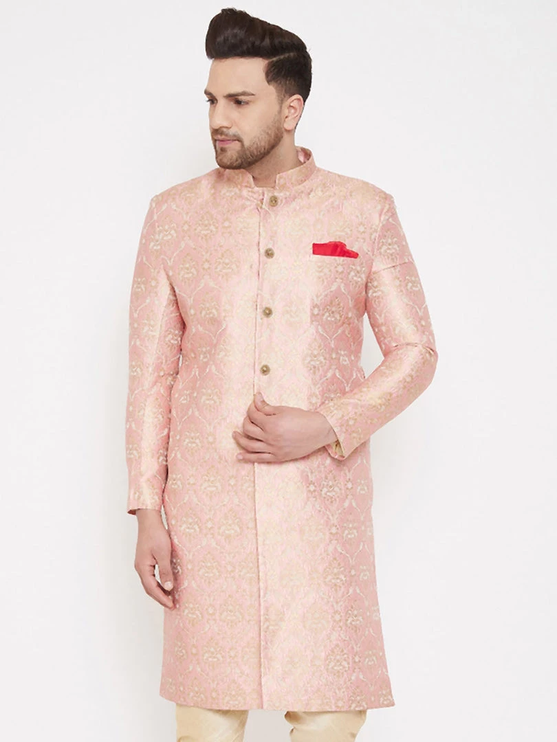 Pink solid coloured mandarin collar sherwani has long sleeves, full front button placket, straight hem, side slits