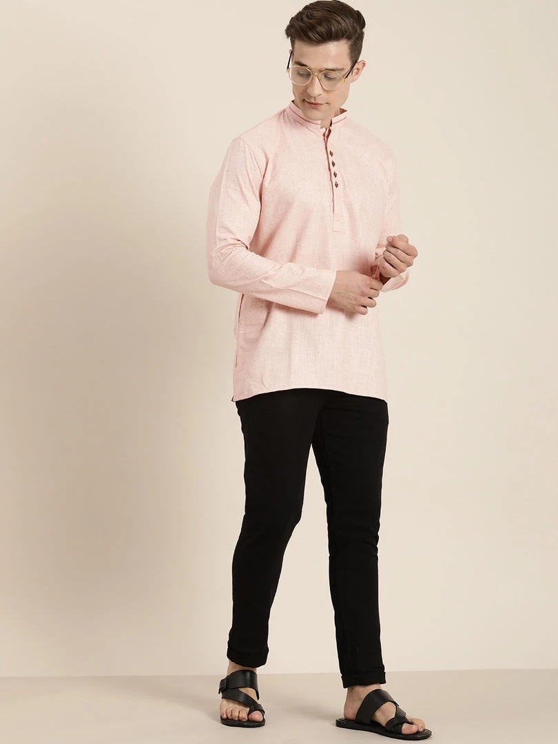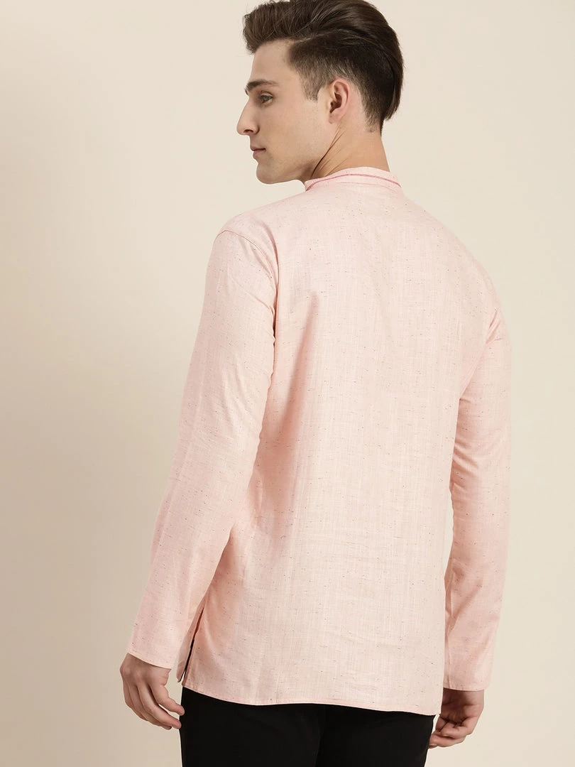 Pink solid cotton kurta has a mandarin collar, a full button placket, sleeveless, above knee with straight hem