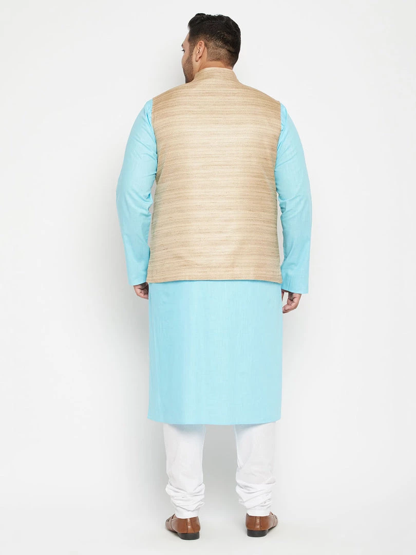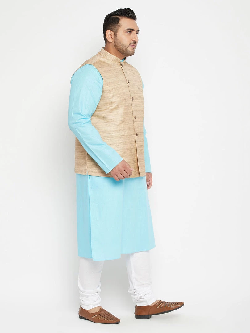 Aqua solid kurta with solid churidar and beige Nehru jacket