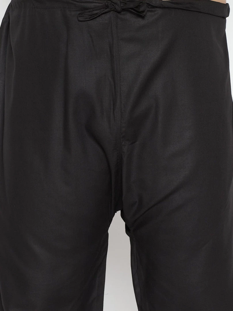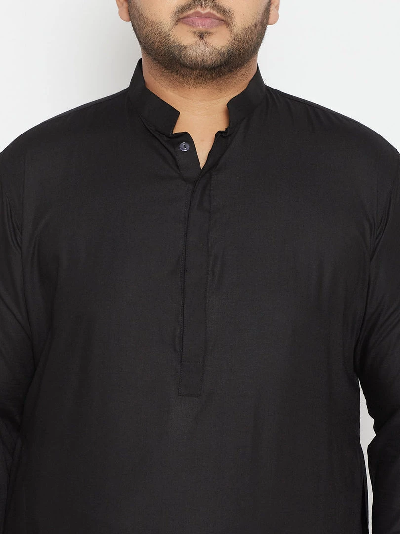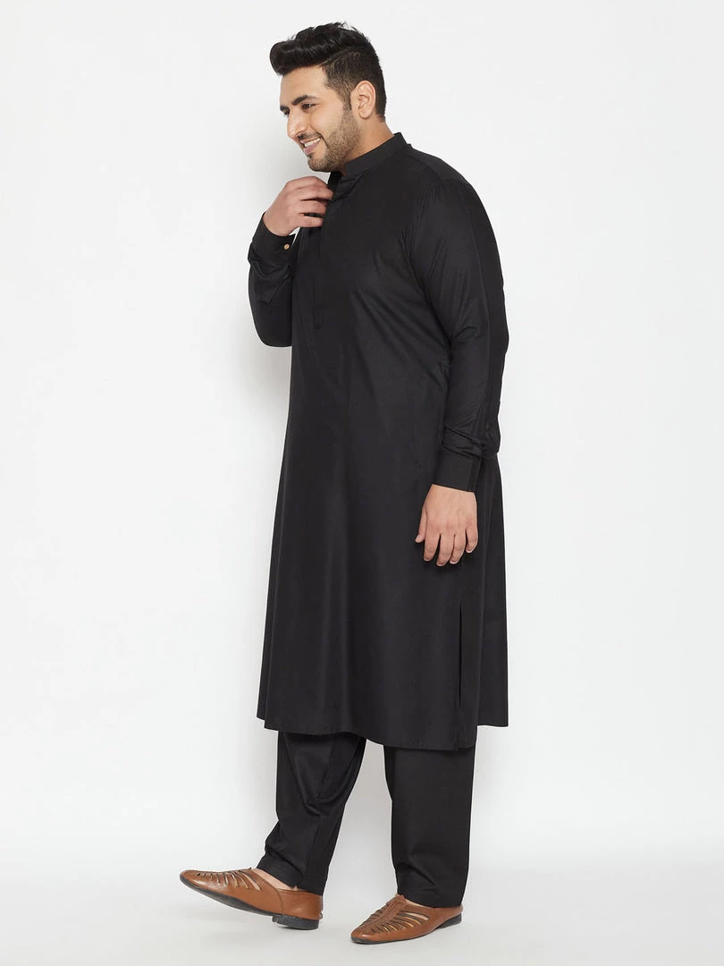 Black solid knee length pathani straight kurta, has a mandarin collar, long sleeves with cuff, button placket, straight hem, side slits