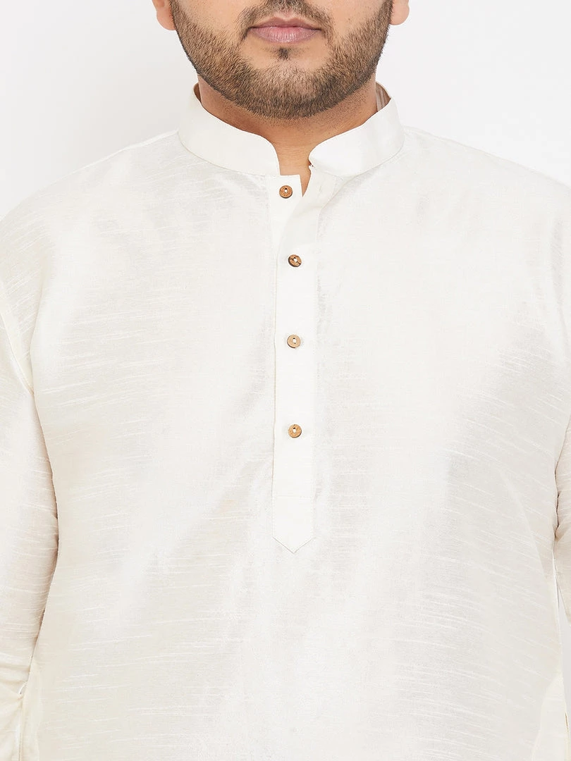 Cream color straight kurta, has a mandarin collar, long sleeves, button placket, straight hem, and side slits