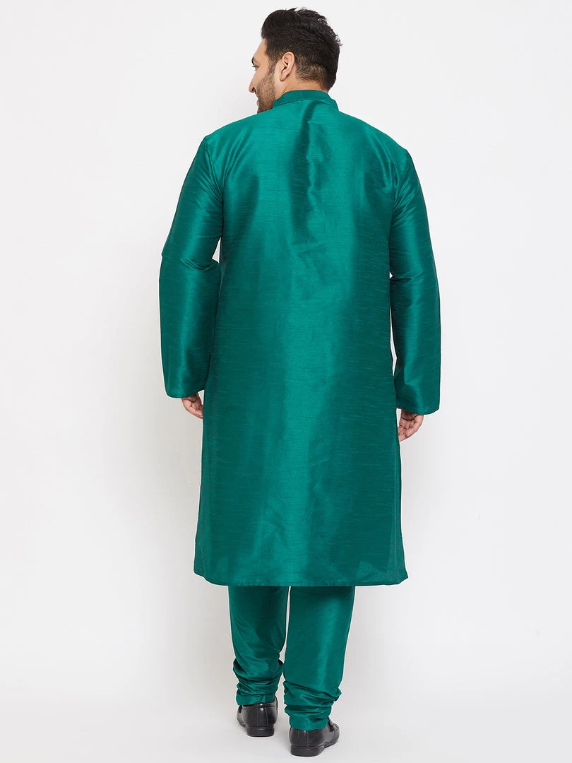 Green solid knee length straight kurta, has a mandarin collar, long sleeves, button placket, straight hem, side slits