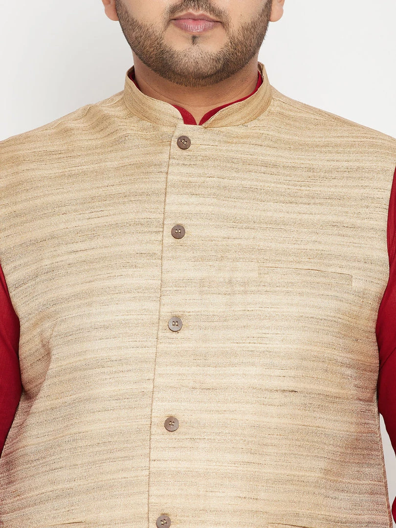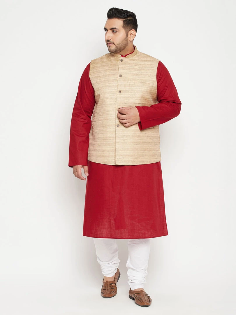Maroon solid kurta with solid churidar and beige Nehru jacket