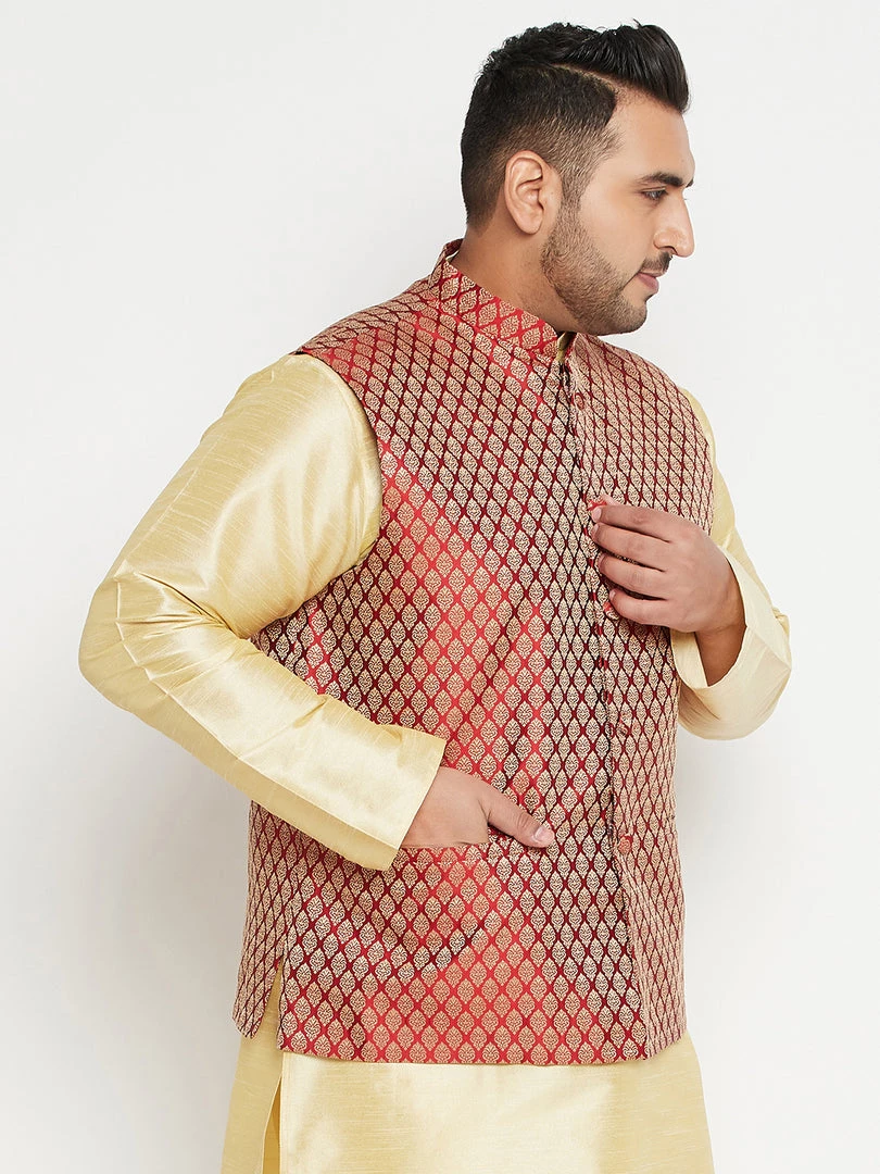 Maroon and beige woven straight nehru jacket, has a mandarin collar, sleeveless, full button placket, three pockets and side slits.