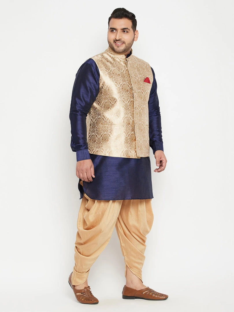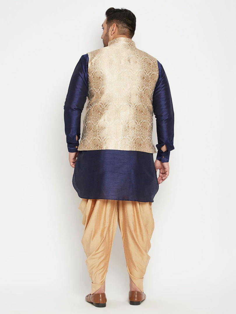 Navy blue solid kurta with solid dhoti pant and golden Nehru jacket