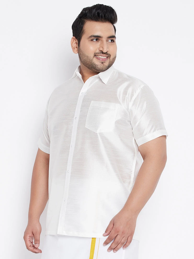 White solid ethnic shirt, has a shirt collar, half sleeves, full button placket, straight hem, side slits and a patch pocket