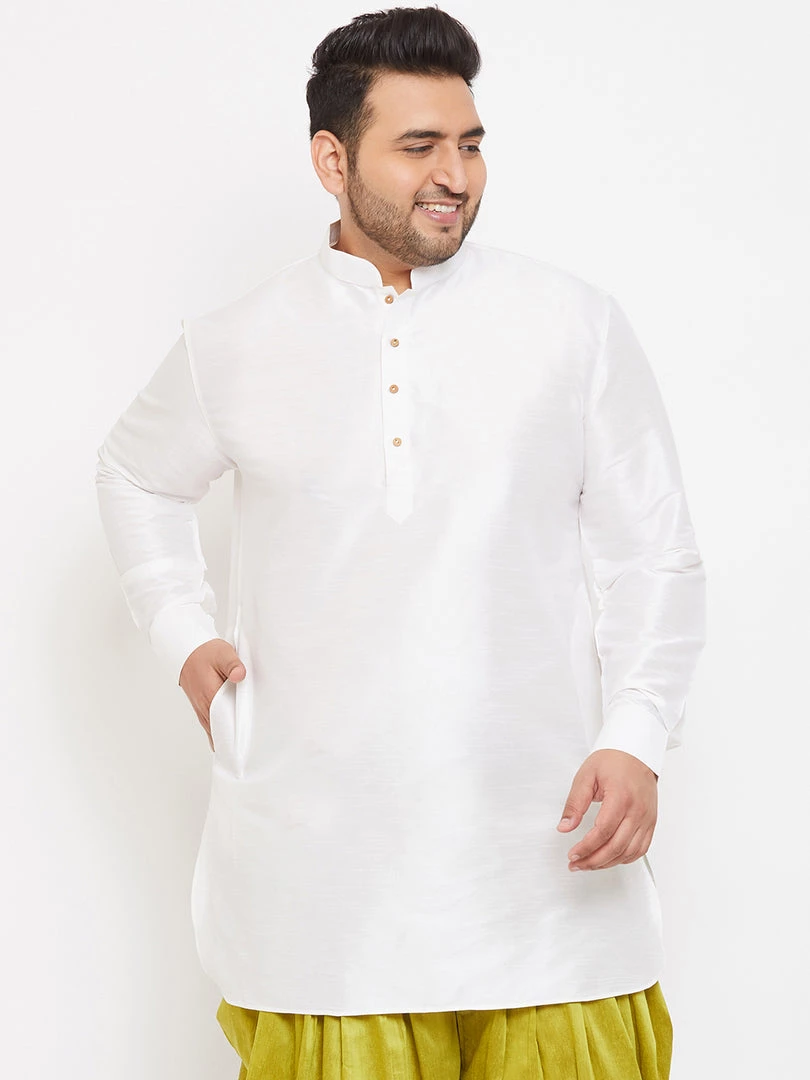 White straight above knee length kurta, has a mandarin collar, long sleeves with cuffs, button placket, curved hem, and side slits